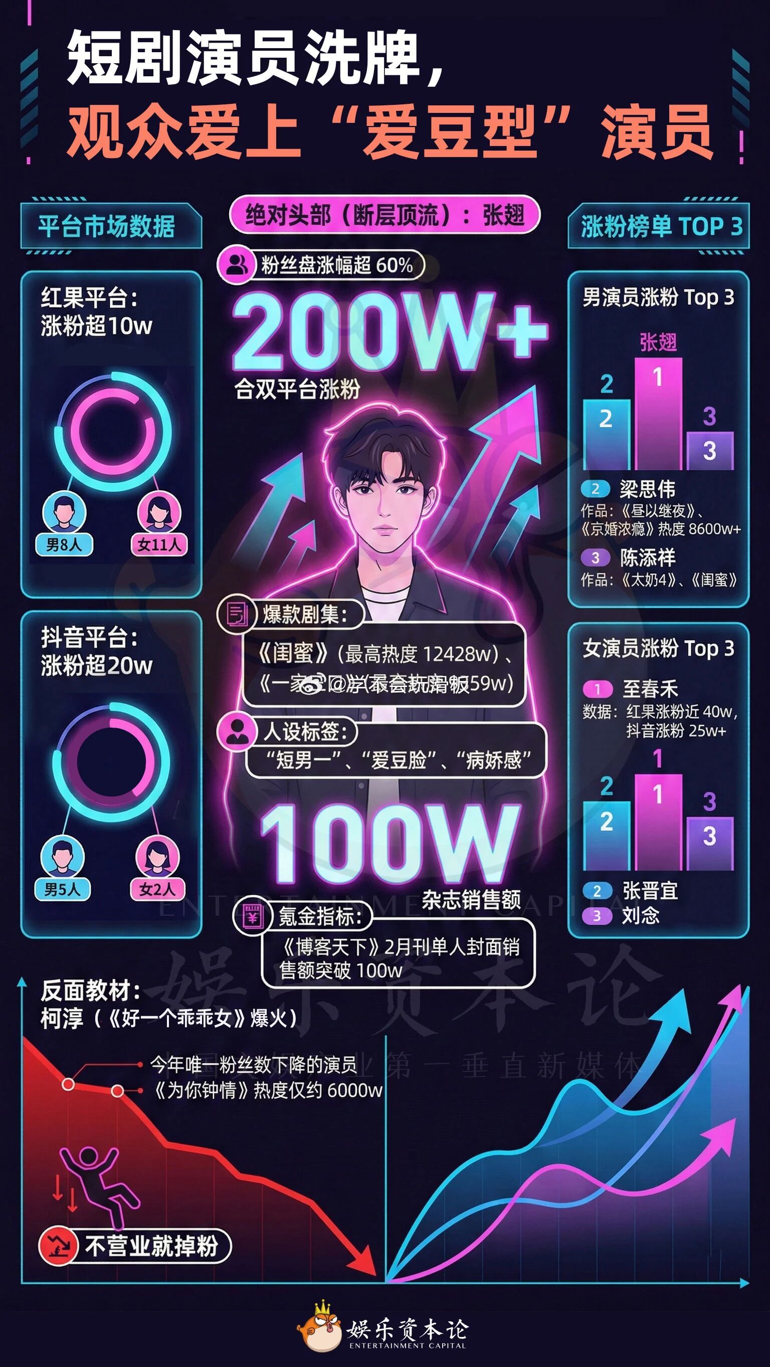 短剧演员爱豆化短剧演员偶像化转型以张翅、吴添豪为代表的新晋短剧顶流,正全方位复刻内娱流量艺人的成熟运营模式,短剧演员的偶像化转型步伐也在持续加快。这批新晋顶流从开通个人工作室账号、进行规范化的形象与运营管理,到日常保持高频次密集营业、维持与粉丝的高频率互动,再到登上地方卫视春晚、接连承接各类商业商务活动,整体发展路径与内娱流量爱豆高度契合。其商业发展路径也不再局限于短剧剧集本身,而是向杂志、商务、晚会等多领域拓展,让短剧演员的职业发展边界得到大幅拓宽。
