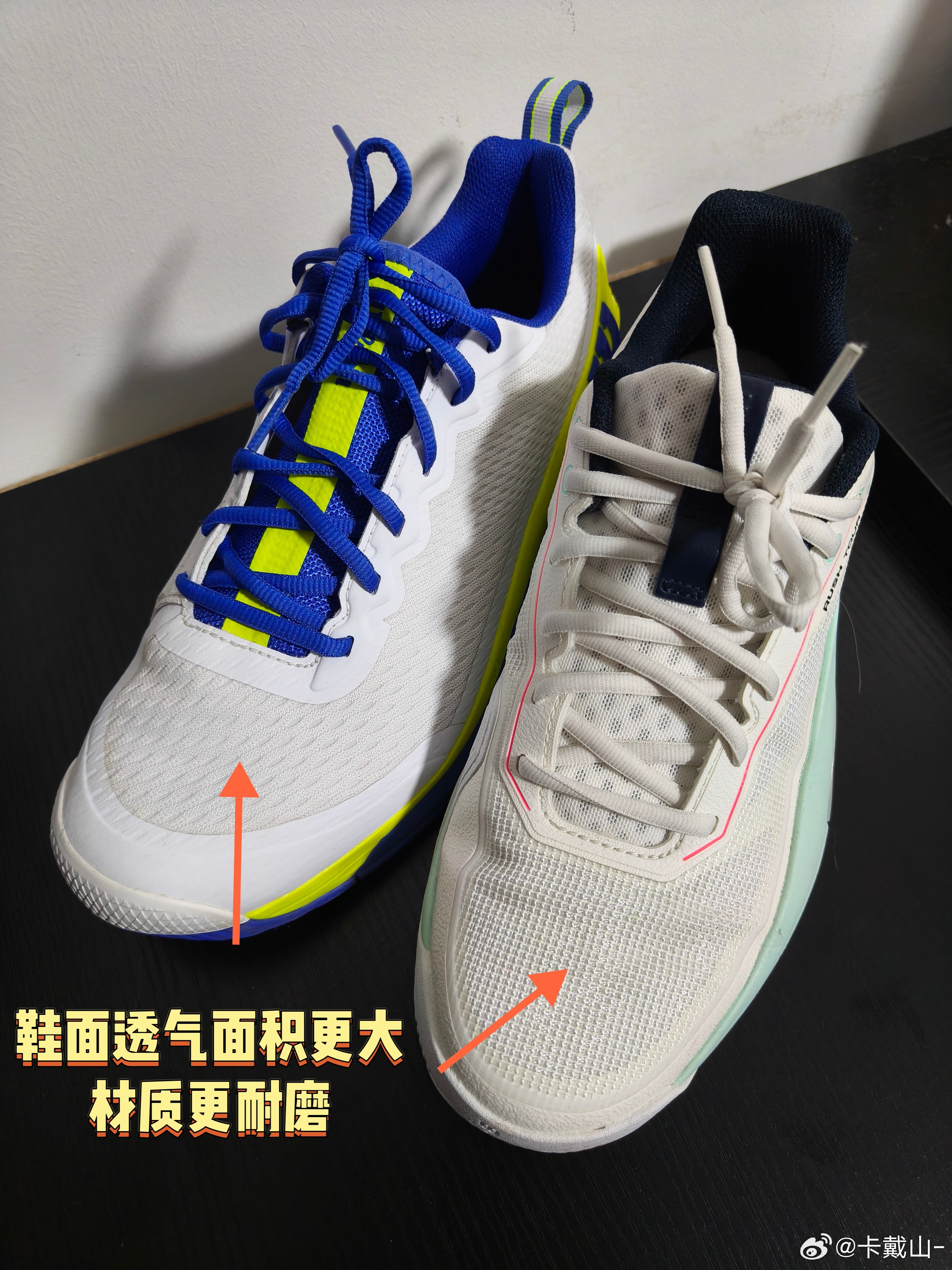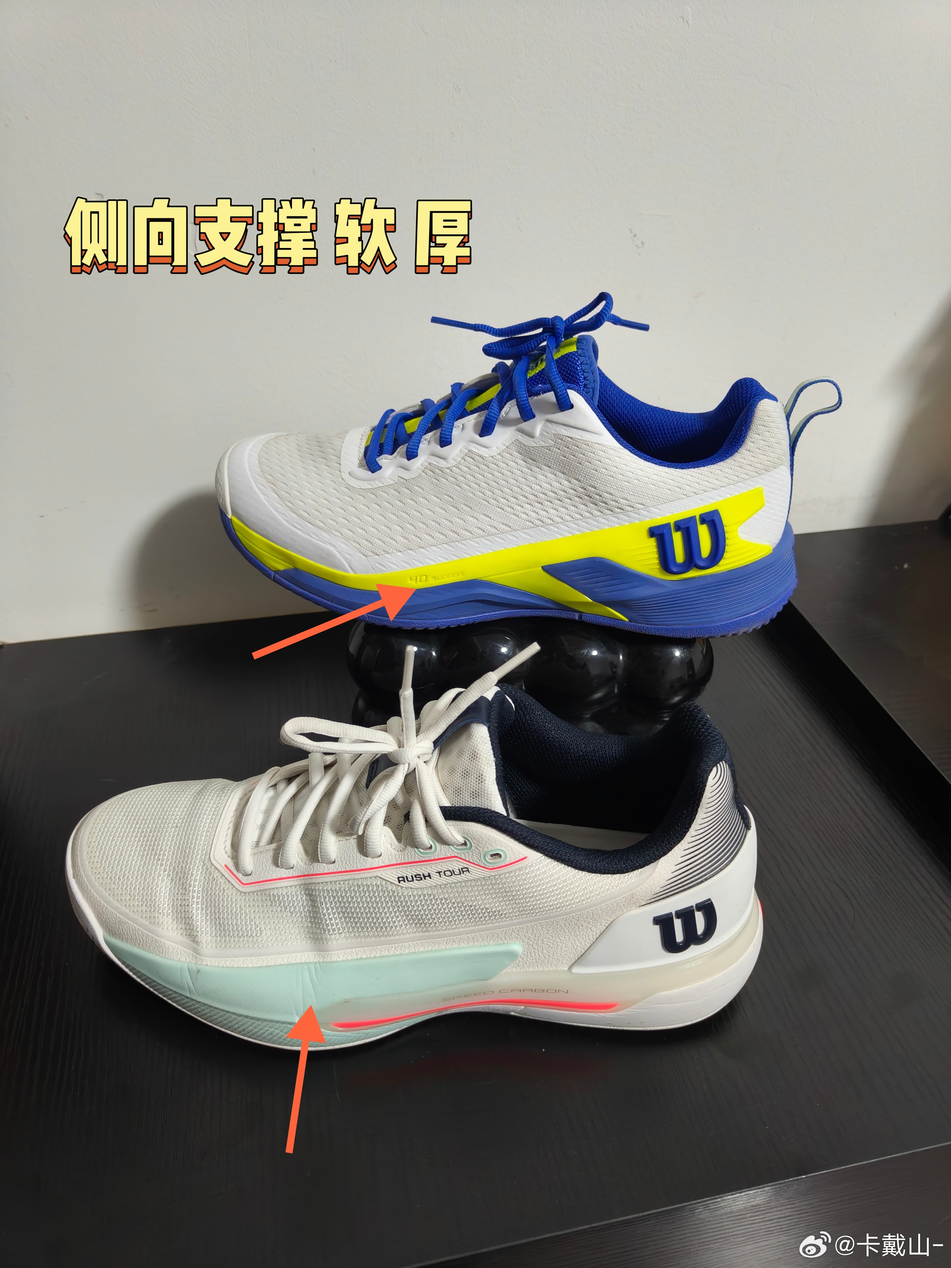 马年的第一场球,我穿着Wilson Rush 5 tour打了五个小时的单打和双打。正好我过年前因为特别喜欢去年美网的配色,又买了一双Rush 4.5 pro,今天就来对比一下这两款鞋,和大家分享它们的不同之处。