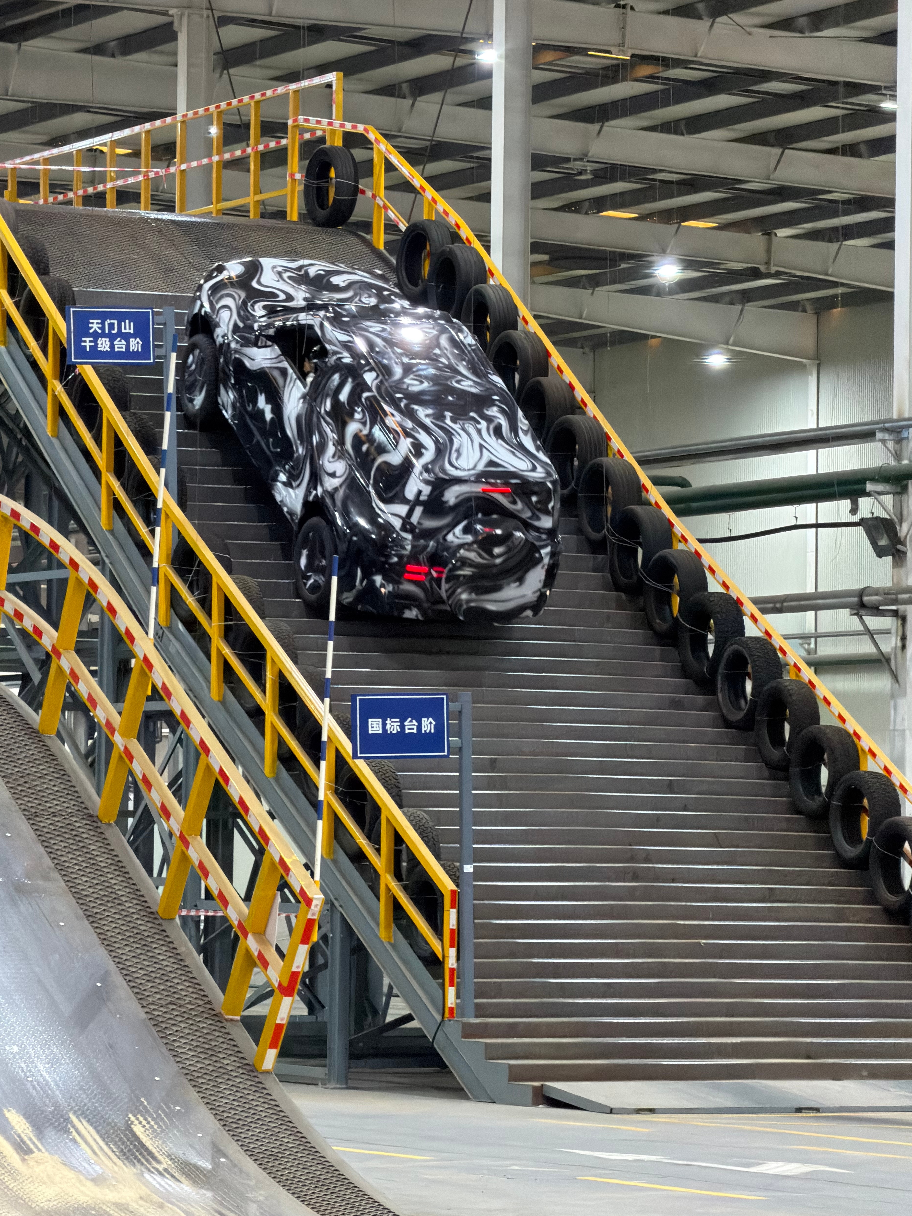 啥?比亚迪把天门山天梯搬进了厂房 ,这种极限测试也太震撼了啊! 要知道天门山的千级台阶,看着就很陡,行人爬起来都觉得累,何况是一辆车,而且这个复刻的陡坡工装路面用的还是钢板,比起天门山的台阶,车辆行驶起来更难,更易打滑,不过一旁的电子显示屏显示,这是第1289次测试。 不得不说,这越野性能是真够强大,爬的稳还不打滑,轻松到顶。结合近期比亚迪将发布颠覆性技术来看,这很大概率应该是一项很顶尖的越野技术,而能首搭载的车,大概率会是新款仰望U8,毕竟这伪装车已经掩盖不住U8的硬派越野风格了。 得亏距离3月5号的技术发布会已经不远了,至于新款仰望U8还有哪些黑科技,真的很期待,毕竟每年车圈技术发布会,迪子的看点还是挺多的。