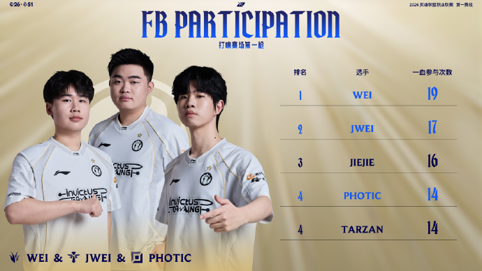 LPL官方发布第一赛段至今的一血参与数,Wei以19次位列第一