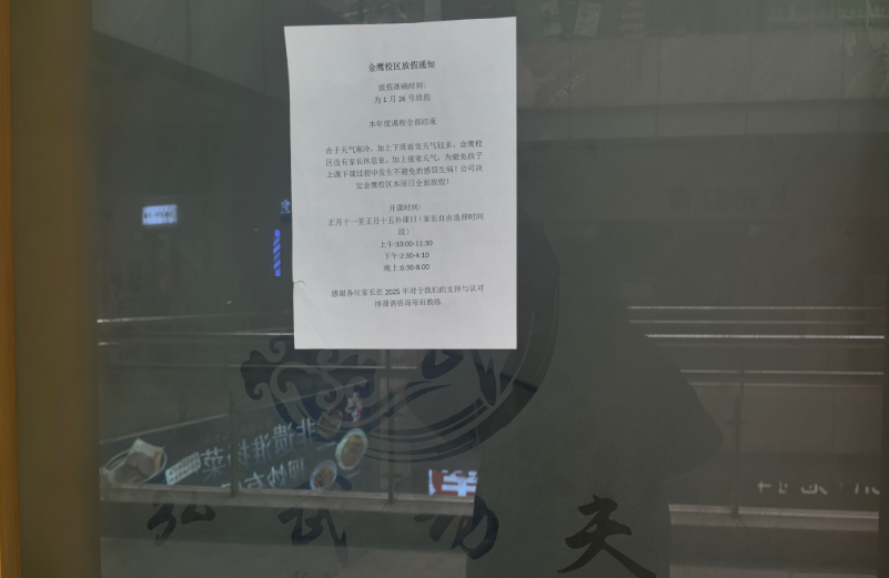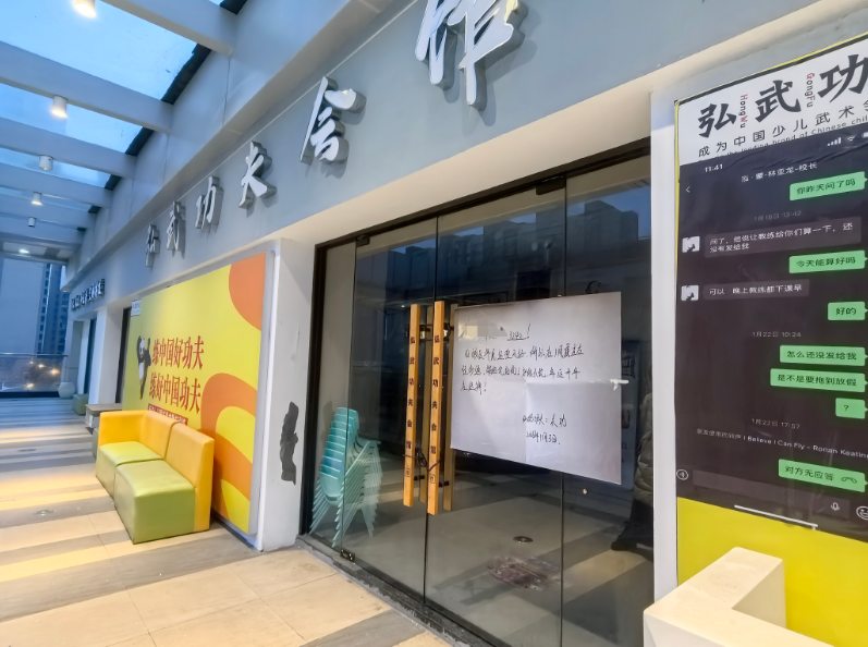 3日上午,记者又来到弘武功夫金鹰店,该门店同样大门紧闭。门店玻璃门上张贴的开课通知显示,计划正月十一至正月十五恢复上课,如今早已过了复课时间,却始终未见工作人员与学员身影。记者在现场看到,金鹰店内的部分办公设备等已搬空,地上散落着许多文件袋等。