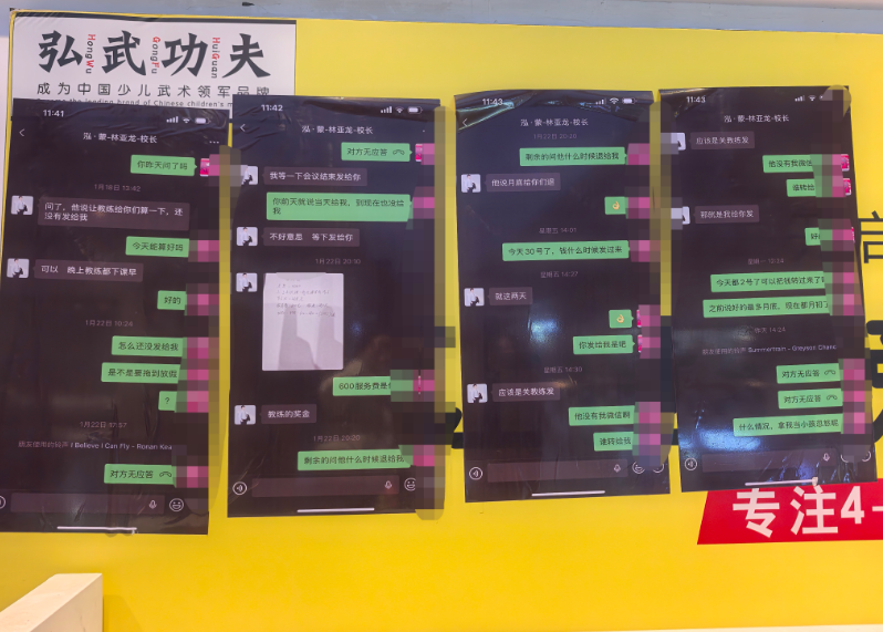 市民赵女士(化姓)告诉记者,去年暑假,她为两个孩子在弘武功夫金鹰店缴纳9000余元培训费,初衷是让孩子强身健体、学习防身技能。后期孩子不愿继续上课,赵女士便与门店协商退费,年前仅退还部分费用,对方承诺剩余款项年后结清。可春节过后,赵女士从其他家长处得知门店已关门,再联系工作人员时,消息已无人回复。