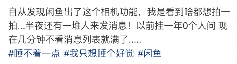 新版闲鱼拍照就可以赚钱狠不下心断舍离的朋友有福了!闲 鱼 新上线“闲 鱼 相 机 ”,在“发闲置”入口打开 闲 鱼相机,对着闲置物品随手一拍,系统就能自动识别图中物品并 给 出 价 格 和商 品 描 述 相关信息功能向信息!再也不用纠结要设定多少 价 格 和商品详情了!会拍照就能 赚 钱 !