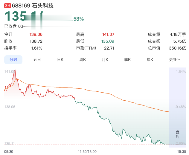 今日收盘,石头科技股价跌2.58%,报135.14元/股。