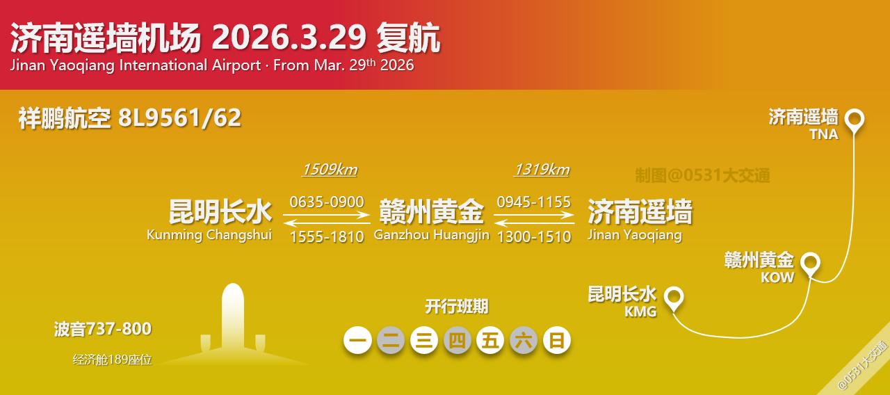 2026年夏秋航季,祥鹏航空新开8L9439/40大理凤仪-泸州云龙-济南遥墙航线,3月31日起每周二四六开行,全经济舱波音737-700执飞;另3月29日起每周一三五日恢复8L9561/62昆明长水-赣州黄金-济南遥墙航线,全经济舱波音737-800执飞[吃瓜群众][吃瓜群众]。此前,济南-大理航线仅在2020-2022年间由西藏航空开行过,三个航季间西藏航空济南-大理航线曾经停南昌/长沙/西宁/泸州等地,此次新增航线为祥鹏航空首次执飞济南-大理航段[无辜笑][无辜笑];另外昆明-赣州-济南航线恢复后,济南-赣州间航线达到每周11班【均为祥鹏航空执飞】,祥鹏航空新航季在济南机场的通航机场达到7座【成都天府/昆明/泸州/西双版纳/丽江/大理/赣州】,济南机场在云南的4座通航城市均有祥鹏航空航班[奸笑][奸笑]