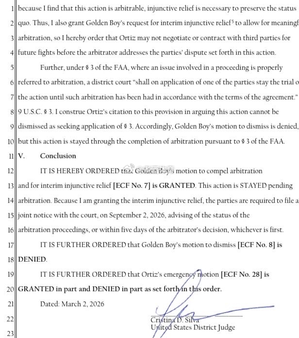 奥斯卡·德拉霍亚(Oscar De La Hoya)旗下的 金童推广Golden Boy 胜诉!这意味着 小维吉尔-奥尔蒂斯(Vergil Ortiz Jr)目前不得与贾龙-恩尼斯(Jaron 'Boots' Ennis)商谈比赛事宜。