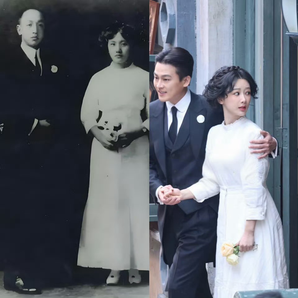 杨紫董竹君结婚路透 剧组道具组服装组都很认真啊,新郎的胸花,新娘的手捧花都还原了!杨紫好美!
