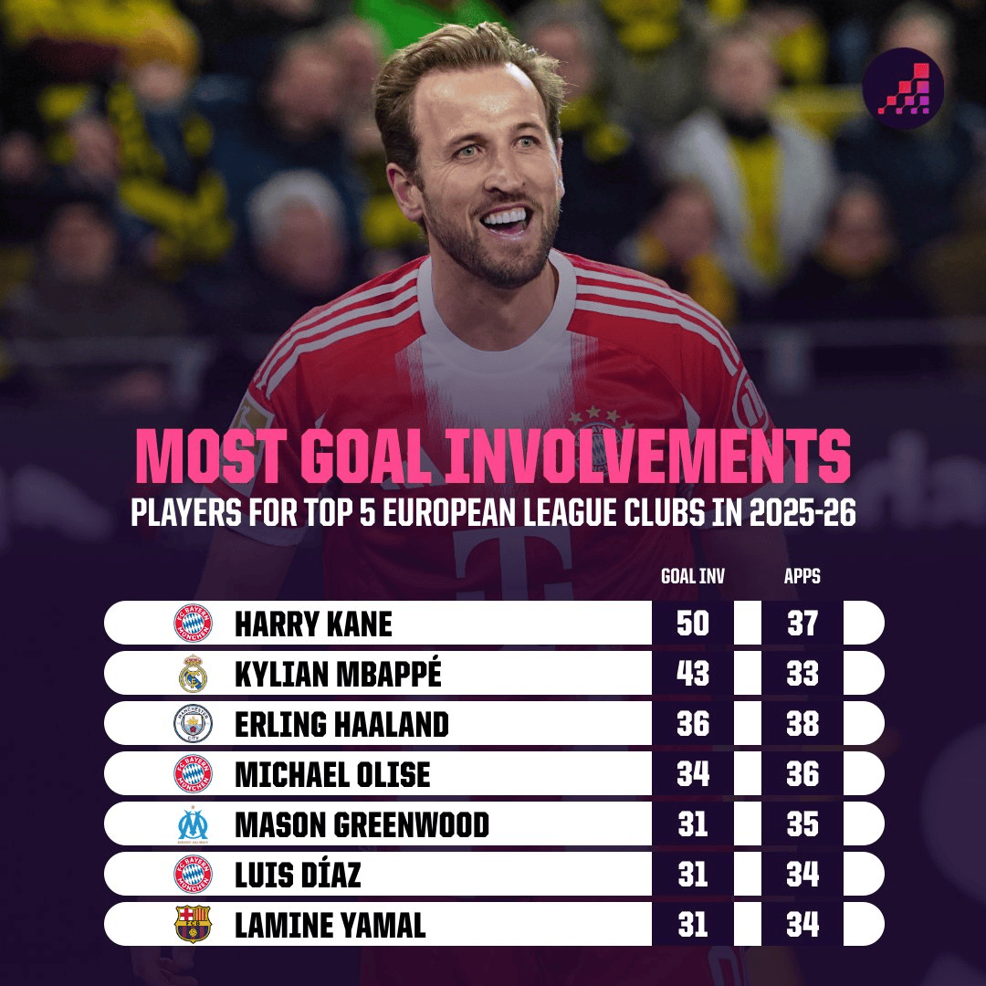 虎扑03月03日讯OptaAnalyst统计了本赛季五大联赛各项赛事参与进球最多的球员,详情如下: