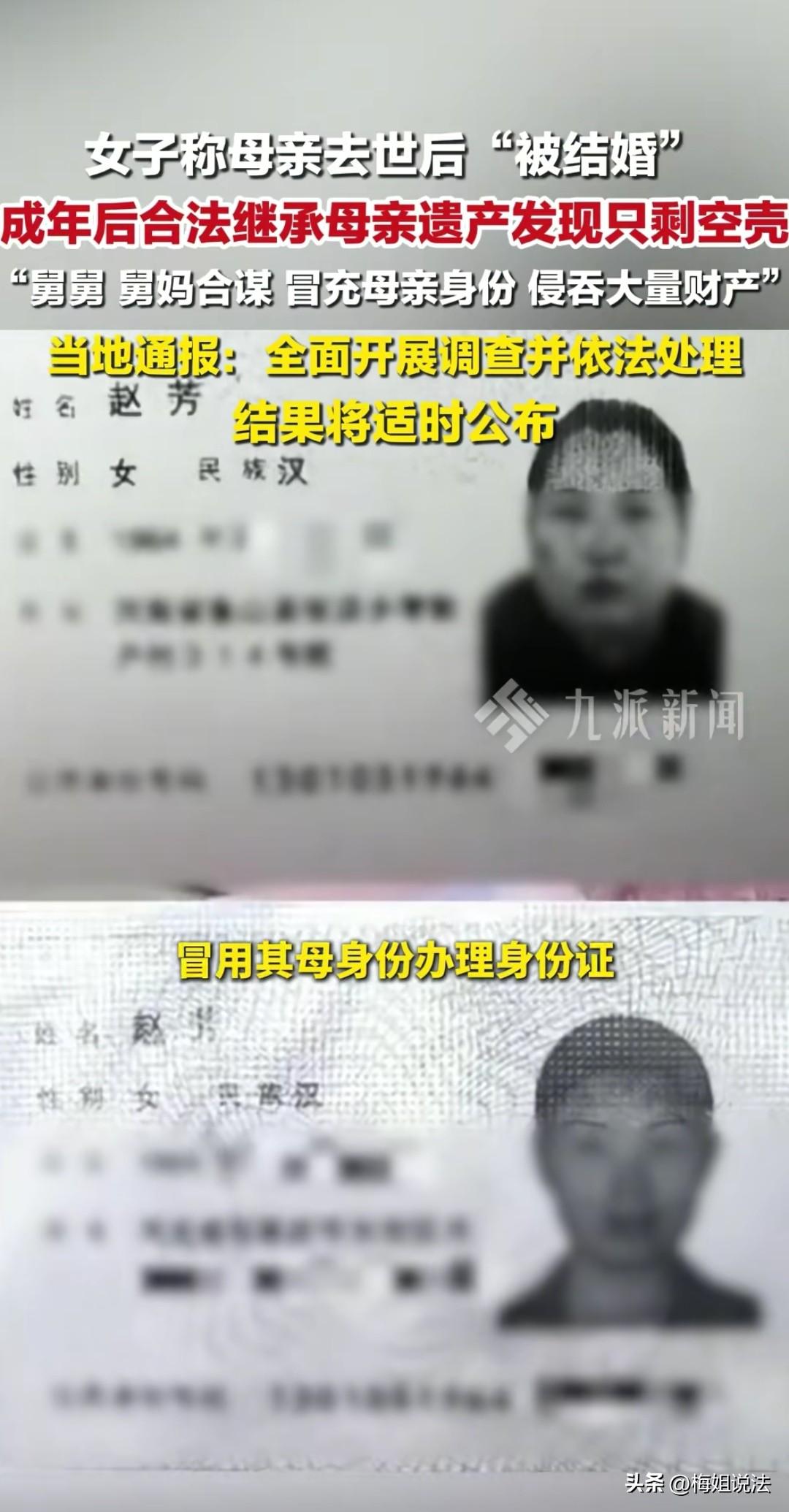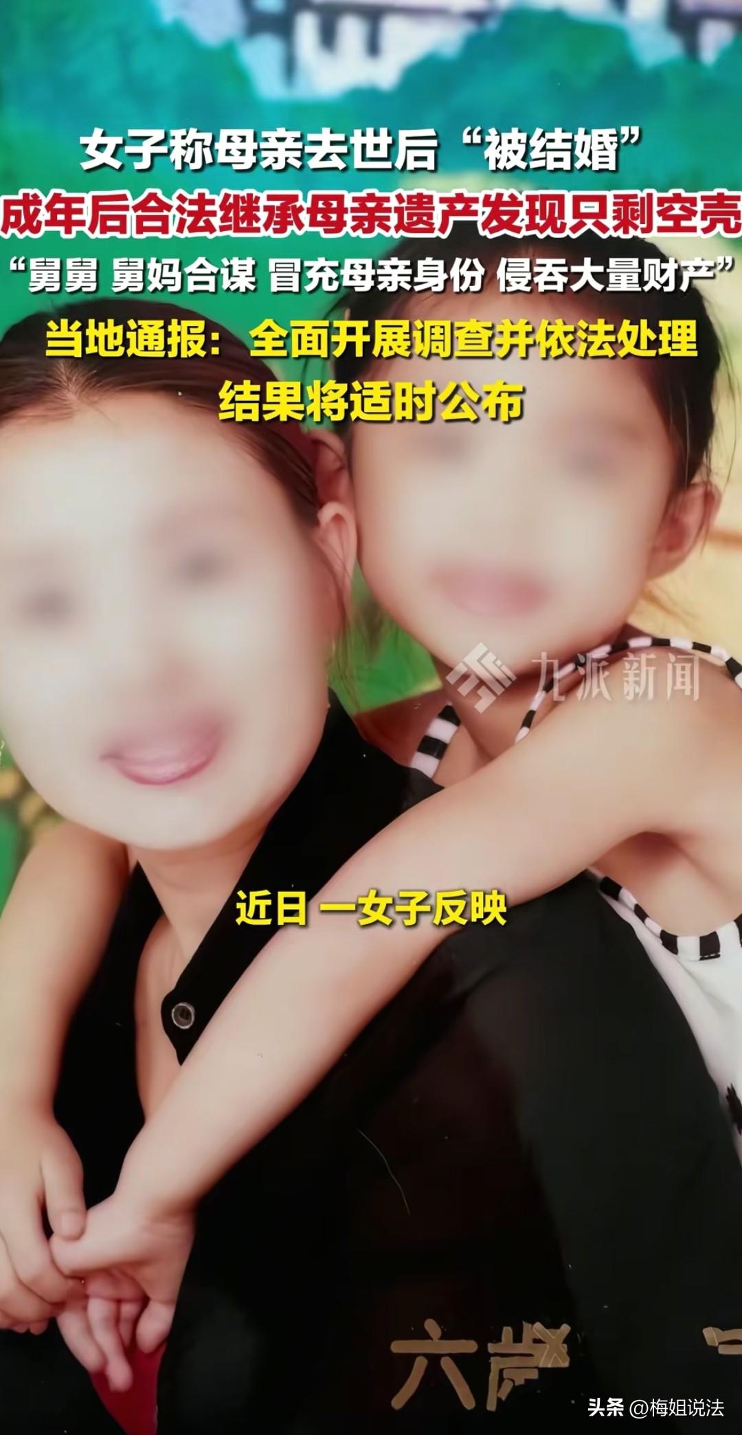 河南鲁山,成年后的孙女士继承妈妈的巨额遗产,财产不翼而飞,只剩下一间商铺。而且无兄弟姐妹的孙女士被告知是非独生子女,经过深入调查,离奇的是母亲死亡后第二年和亲舅舅结婚了,结婚证上却是舅妈的照片。 事情回到2008年,只有9岁的孙女士母亲病逝,虽然这个年纪对死亡没有深刻体会,但是她知道永远见不到妈妈了,常常在没人的地方偷偷抹泪。 时间总会让痛苦慢慢淡化,小姨抚养长大,陪着她,安慰她,只是在成长过程中提及妈妈,小姨提供的信息不多,好像不愿意多说。 而且她多次想见爸爸,都被小姨拒绝,可以打电话,但是不能见面,所以从小到大他收到了很多爸爸寄来的礼物,但是爸爸的拥抱一次也没感受过。 孙女士成年后去独自一人去继承财产,被相关部门告知名下只有一间商铺,她从小就知道家里算有钱人,妈妈买了不少房产,还开珠宝公司,怎么可能只有一间商铺,就让工作人员好好查查,不查不知道,一查吓一跳,孙女士不是母亲的唯一子女。 孙女士懵了,这是不可能的,从小到大,就没听谁告诉过她还有兄弟姐妹,即使小姨舅舅不给说,给爸爸电话联系那么多年,也从来没透漏过一丝半点。 肯定工作人员马虎搞错了,就和工作人员争吵起来,我的家庭成员我能不知道吗,我家的财产虽然我不知道具体数额,但是有什么财产我还是知道的。 工作人员也急了,说你自己看。孙女士看到电脑界面,在事实面前,孙女士彻底无语了。 嘴里一直嘟囔着,不可能,我爸妈就我一个孩子啊。 冷静后又请求工作人员查查具体啥情况,怎么就多出来兄弟姐妹呢。 通过查阅,工作人员你妈2009年结婚了。 2009年?孙女士实在不敢相信自己的耳朵,麻烦你再看看,这次肯定错了,就算结婚不错,时间肯定错了,我妈2008年就去世了,怎么可能第二年结婚? 工作人员也很惊讶,安抚说你到别的部门再去查查。 孙女士六神无主的坐下来,想着给小姨打电话问问情况,转念一想还是自己去调查比较好。 于是一个个疑点去调查。 首先就是妈妈2009年结婚的事,去相关部门真的找到了结婚证,可是当她看到照片是又是当头一棒,照片中的女子根本不是妈妈,而是她的舅妈,但是身份信息是妈妈的。 2008年孙女士母亲去世时应该办销户手续了,怎么2009年还有身份信息,而且还结婚了,还是和亲弟弟结的婚。 可是调取档案时,2008年并没有销户文件,反而是2013年孙女士的母亲被销户了。 难道2013年孙女士的母亲才去世?2013年之前一直活着,躲着不见孙女士?不成立啊,即使她妈活着,又结婚了,为什么照片不是本人的? 此时孙女士突然想起9岁那年,家人告诉她妈妈离开了,她哭着要去看妈妈,但是家人阻止她去。 她一直以为家人是怕她难过,后来她听说当时土葬了,也没办葬礼,这样看来,肯定另有隐情。 一个她从没有过的恐惧袭来,难道都是阴谋? 后面的调查越来越震惊,孙女士母亲去世后签委托书卖石家庄的房产,收款人是小姨。 已经去世的妈妈怎么签的委托书,舅舅和妈妈是怎么领的结婚证?舅妈是怎么取得妈妈的身份信息的,又怎么办理的销户手续,不由得不让孙女士多想。 种种疑团还待解开。 孙女士的遭遇就像一部悬念迭起的电影,这件事已经成立联合调查组,至于真相到底是什么,一定有水落石出的那一刻。 自小失去母亲的孙女士,又被小姨要求十年不准见父亲,这本身合理吗? 《民法典》第27条,父母是未成年子女的监护人。 《民法典》第1086条,离婚后,不直接抚养子女的父或者母,有探望子女的权利,另一方有协助的义务。 不管谁有抚养权,父亲都有权利探望自己的子女。 来源@九派新闻