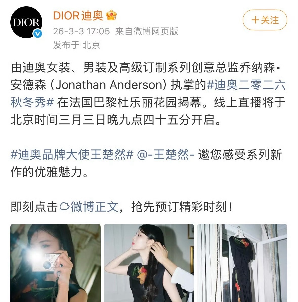 迪奥官宣王楚然王楚然这波赢麻了迪奥大秀当天官宣空降品牌大使巴黎时装周 大放异彩!
