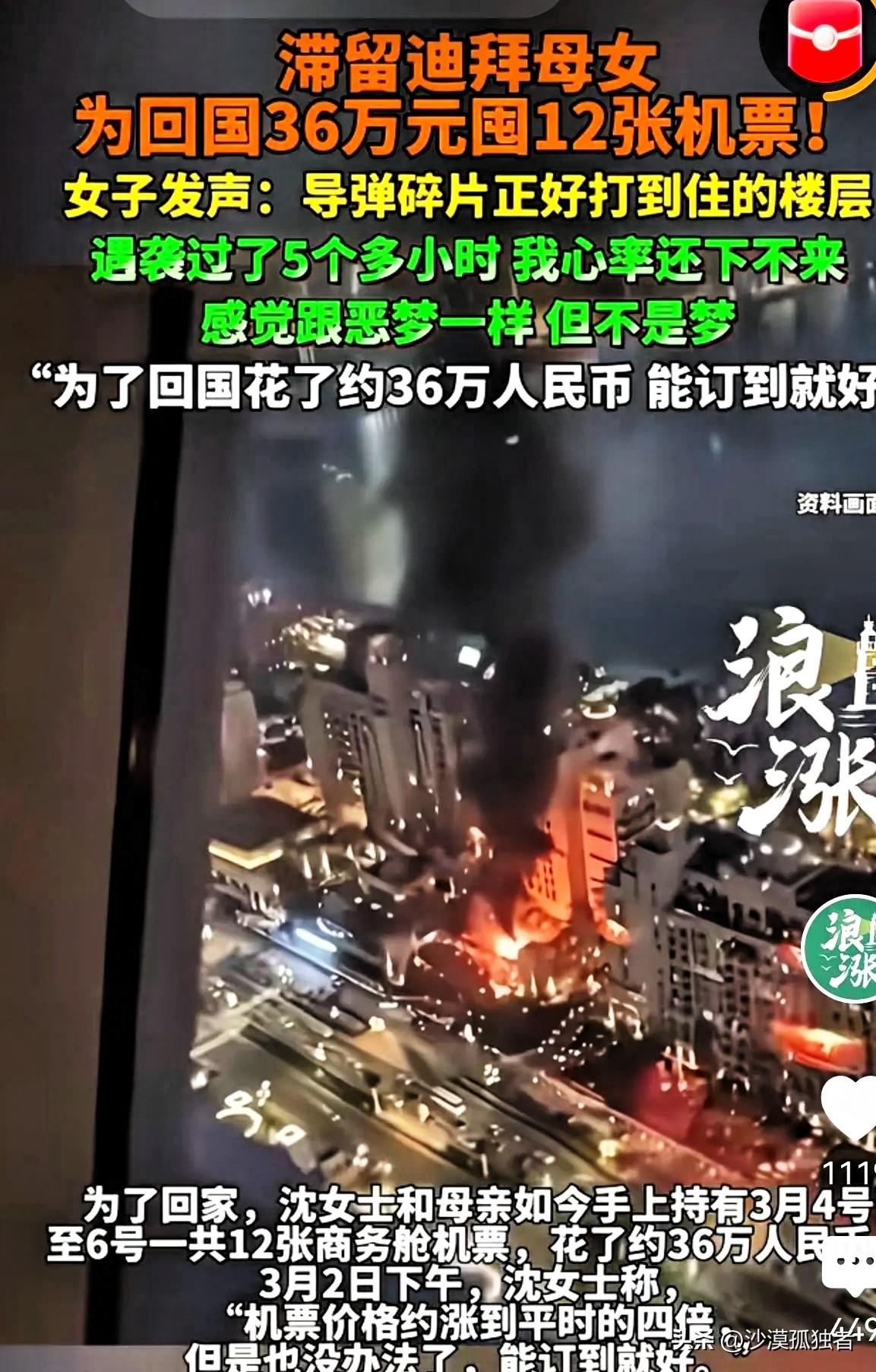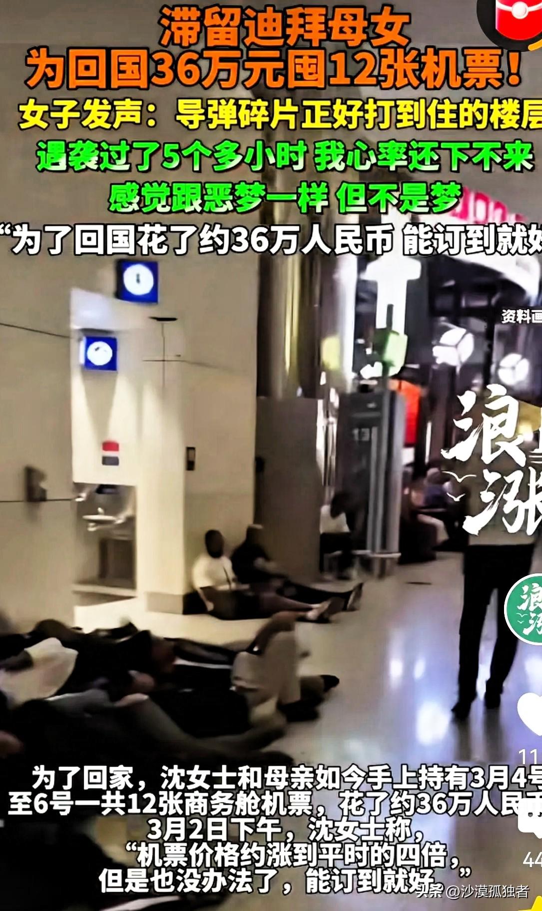 “命比钱重要!”一女子带着母亲去迪拜旅游,为尽快回国,花36万囤了12张机票,赶上哪班是哪班,她本打算3月7日回国,可导弹碎片直接打到她所住酒店楼顶,吓得她拿着护照钱包,拉着母亲撒腿就跑,遇袭后,5个小时她心率都没下来,她决定豁出去了,即使机票涨了4倍,她还是花36万,买了3月4日-3月6日12张机票,只要能保住命,她啥都顾不上了。网友:钱花少了,母女二人花3.6亿美元包一驾专机就飞回来了。 这事儿听着像电影情节,但真摊人身上,谁哆嗦谁知道。这位女士姓刘,天津人,带七十多岁的老母亲去迪拜本来是散心,看看帆船酒店,逛逛黄金市场,老太太一辈子没出过国,闺女想着趁腿脚还利索,尽尽孝心。出发前还发朋友圈,配图文案写的是“带老妈看世界”,底下点赞一片。 谁能想到,世界没看全,差点把命搭进去。 那天晚上刘女士刚洗漱完,准备刷会儿手机睡觉,突然轰的一声,整栋楼都在晃,窗户外头火光冲天。她第一反应是地震,拉着老母亲就往卫生间躲,后来才知道是导弹碎片砸到楼顶了。老太太腿都软了,扶着墙直哆嗦,嘴里念叨“这是咋了这是咋了”。刘女士后来说,那五分钟她脑子一片空白,就记得攥着母亲的手,手心全是汗。 等稍微消停点儿,她抓起护照、钱包,连行李箱都没顾上拿,拖着母亲就往楼下跑。酒店大堂乱成一锅粥,各种语言混在一起,有人哭有人喊,有个中东模样的妇女抱着孩子坐在地上发呆,孩子脸上全是灰。刘女士说她那一刻突然明白了什么叫“兵荒马乱”,以前在电视上看的那些画面,现在自己就在里头。 回到房间后她一夜没睡,拿手机刷新闻,刷航班信息,手一直在抖。心率手表响了好几次警报,提示她心率过快。她说那五六个小时,心跳就没下来过,躺床上都能听见自己咚咚咚的心跳声。 天亮之后她开始订机票。问题是,这个节骨眼上,航班要么取消要么暴涨。原来两三千块的经济舱,现在直接翻到一万多,还得抢。刘女士不犹豫,她算了一笔账:3月4号到6号,只要时间能对上,不管哪趟航班,只要能飞就买。最后三天时间里,她一口气买了12张票,有阿联酋航空的,有国航的,有南航的,甚至还有一班经停曼谷的,加起来花了36万。她跟我说这事儿的时候,我第一反应是“疯了吧”,她回了我一句话,我到现在都记得——“疯什么疯,命没了,钱留着给谁花?” 这话糙,理不糙。 后来她们娘俩总算在3月5号晚上挤上了一趟飞北京的航班,座位是最后一排,挨着厕所,连窗户都没有。但刘女士说那是她这辈子坐过最踏实的一趟飞机。起飞那一刻,老太太攥着她的手说“回家了”,她眼泪唰就下来了。 这事儿发到网上之后,评论区吵翻了。有人说她有钱任性,36万够普通人家过好几年;有人说她明智,生死面前钱算个屁。还有个网友嘴损,留言说“钱花少了,母女二人花3.6亿美元包一驾专机就飞回来了”,底下还有人跟帖说“对对对,再雇个航母护航”。这种评论看着像开玩笑,但往深了想,其实就是站着说话不腰疼。真把你搁那地方,导弹在你脑袋顶上飞,你试试还能不能这么轻松调侃。 我倒觉得刘女士这事儿没什么可指摘的。她不是富豪,就是个普通生意人,自己开个小公司,这些年攒了点钱,想让老妈享享福。36万对她来说不是小数目,差不多是一年的利润。但命跟钱哪个重,这个选择题在她那儿只有一个答案。 其实想想也挺讽刺的,和平日子过久了,人都忘了活着本身就是最大的奢侈。咱们每天骂外卖送得慢,嫌地铁太挤,抱怨老板画大饼,可世界上有些地方,人家连抱怨的资格都没有,活着就得烧高香。刘女士这次是用36万买了个教训,也买了个明白——有些东西真没了,多少钱都赎不回来。 各位读者你们怎么看?欢迎在评论区讨论。 信息来源:综合抖音、微博、头条新闻等平台当事人自述及网友评论整理。