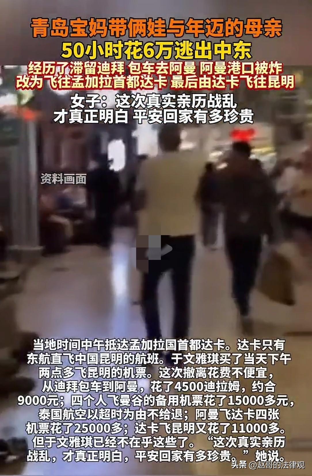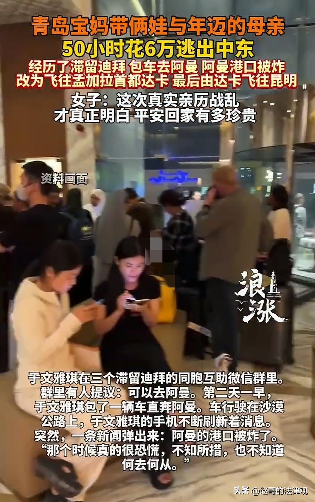 3月2日傍晚6点多,青岛宝妈于文雅琪,50个小时,花了6万元,带着俩娃和年迈母亲,辗转3国逃出中东,路上得知港口被炸,硬着头皮往前闯。直到踩在了国内的土地上,这一刻她才真正松了一口气,过去那50多个小时,对她来说,简直像过了好几年…… 于文雅琪带着两个年幼的孩子,还有年迈的母亲,本来是趟普通的旅行。 万万没想到,遇上了战争,而归家的路竟然这么难! 事情的变化,发生在2月28号下午,她手机突然收到一条消息。 当晚东航飞青岛的航班取消了! 那时候,中东局势突然紧张起来,多哈、迪拜、阿布扎比这几个地方都关了领空,机场也都停了。 她一开始还没太当回事,觉得可能晚个一两天就能走。 结果到了3月1号凌晨两点多,外面突然传来轰隆隆的巨响,声音特别大,听着就跟爆炸似的。 她一下子从床上惊醒了,紧接着,每个人的手机都开始响警报,那个声音在夜里听着格外瘆人。 她当时带着孩子和老妈,心里真的慌了,但又不能慌,得想办法。 那时候,她在三个滞留迪拜的同胞互助群里,里面好几百号人,大家都在刷消息,想出各种办法。 有人说可以去阿曼试试,那边可能还能走。 第二天一早,她就包了辆车往阿曼赶。车子在沙漠公路上开着,她不停刷手机看消息。 突然弹出来一条新闻,说阿曼的港口被炸了。 她当时整个人都懵了,那种恐慌没法形容,不知道该怎么办,也不知道该往哪去。 但那时候已经进了阿曼境内,只能硬着头皮往前走。 她连酒店都没敢订,直接让司机把车开到了马斯喀特机场。 在机场跟柜台磨了好长时间,工作人员人挺好,想办法帮她弄到了4张,3月2号凌晨飞孟加拉国达卡的机票。 航班还专门等了一会儿,晚了半小时才起飞。 坐在达卡机场等下一班飞机的时候,她心里稍微踏实了一点。 那些微信群里还有人在不停问怎么走,她就把自己的路线一遍遍发出去,告诉他们怎么到达卡,落地签怎么办。 从达卡飞昆明只有东航有航班。 她买了当天下午两点多的票,4个人花了11000多。 群里有人说去曼谷的机票,从8000涨到10000,随后又涨到13000,还没票。 那时候真是一票难求,有钱都不一定能买到。 她们那趟航班全坐满了,能买到票真是运气好。 这一路下来,花钱花得她都不敢细算。 从迪拜包车到阿曼,花了4500迪拉姆,合人民币差不多9000。 之前买的4个人飞曼谷的备用机票15000多,因为超时没退成。 从阿曼飞达卡4张票25000,加上最后一程的机票,总共花了60000万多。 她说花了也就花了,没想那么多,能回家就行。 这一趟亲身经历过才知道,平时觉得挺安稳的地方,说乱就能乱起来,说回不来就真的回不来。 她带着孩子和老人,一路奔波,又花钱又受累,还担惊受怕,但她说能平安回来就值了。 有人觉得,能逃离回家还算幸运,有钱真好,能买到惊吓也能买到平安。 有人说,6万元不多,有人买机票要几十万元,但是能看出,这是个有智慧的女人,遇事冷静不慌,能想办法自救。 《领事保护与协助条例》第二条规定:领事保护与协助是指领事机构和领事官员根据国际法、双边条约和协定以及中国法律,在国外保护中国公民、法人和非法人组织的合法权益,提供协助的行为。 也就是说,当中国公民在国外遇到困难或合法权益可能受到侵害时,我国的领事机构(比如驻外使领馆)有责任和义务为大家提供帮助和保护。 本案中,于文雅琪带着家人在中东遭遇战争局势,身处危险之中,属于在国外面临紧急情况的中国公民。 虽然文中没有直接提及领事机构的具体协助行为,但根据该条例,我国驻外领事机构,会在类似情况下为公民提供必要的帮助。 比如协助了解当地局势、提供安全建议、协助联系国内亲属、协调购买回国机票渠道等。 这条法律,为在国外的中国公民提供了坚实的后盾,让大家知道即使在异国他乡遇到危难,国家的领事机构会依法为自己提供支持。 帮助自己维护合法权益、保障人身安全,这也是国家对海外公民的一种保护和关怀。 可以说,于文雅琪是幸运的,只要安全回家就好,有时拿钱也买不到机票,钱乃身外之物真是,算是舍财保命吧。 对此你怎么看? 关注@赵哥的法律观,欢迎评论区发表您的看法。