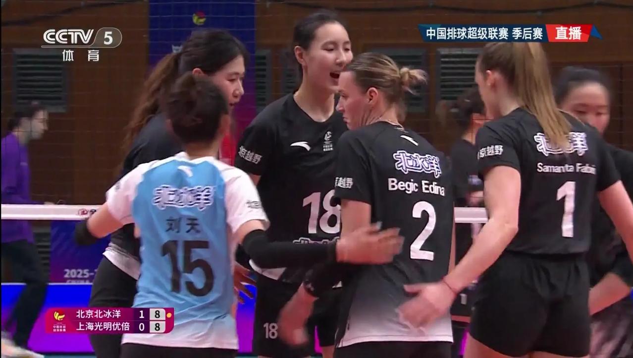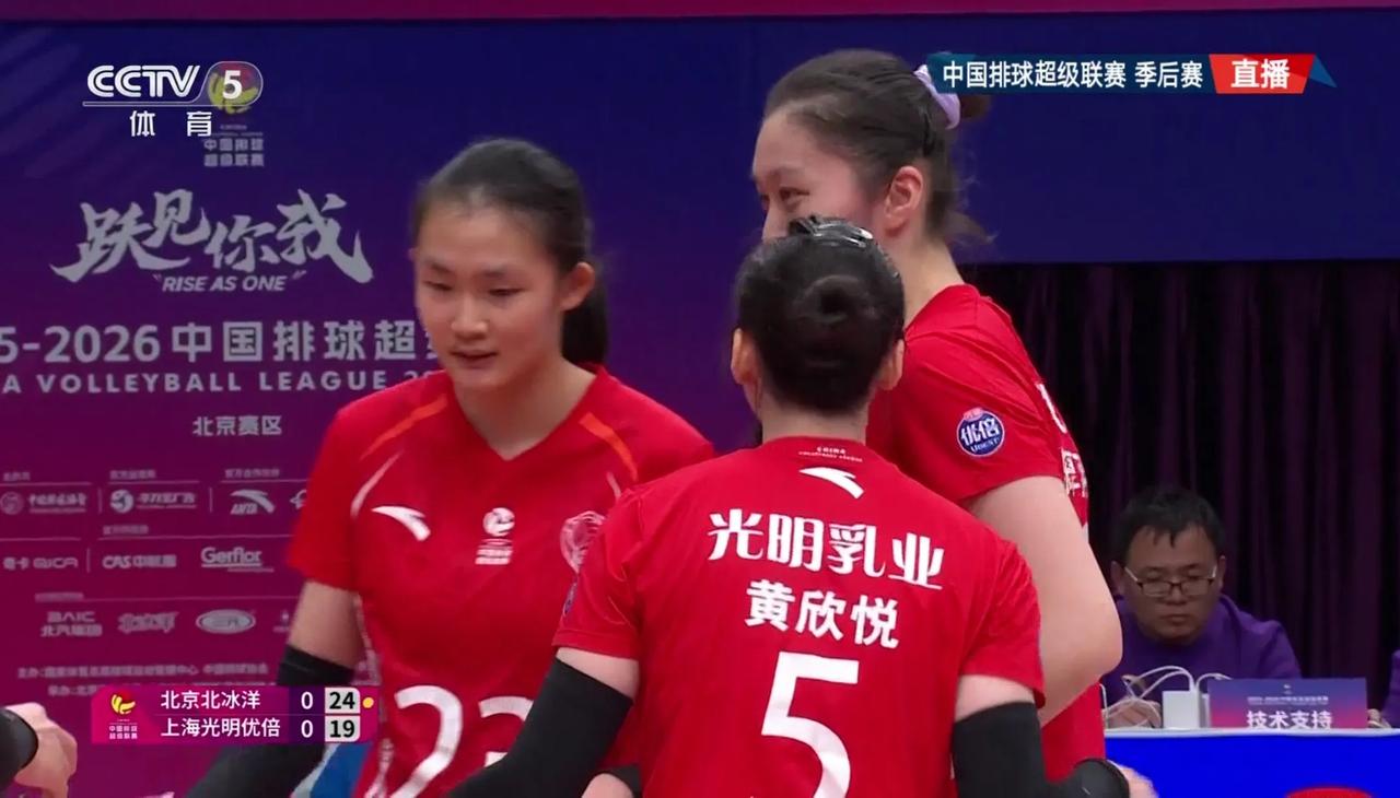 【女排超级联赛】第十七轮:北京——上海 实时战况: 3月3日晚19:00时,女排超级联赛季后赛第三轮北京——上海的比赛,在北京主场打响。第—局开始,1平,4平,4:6,上海领先。6平,北京追平。7:9,北京暂停。8:9,9:11,11平,北京追平比分。13:11,北京反超,上海暂停。14:11,15:11,16:11,北京领先。17:11,19:11,19:13,上海队追分。21:15,金烨发球出界。21:16北京暂停。22:18,北京发球出界。23:19,25:19,北京胜第一局,大比分1:0,北京领先! 第二局比赛正在进行中……