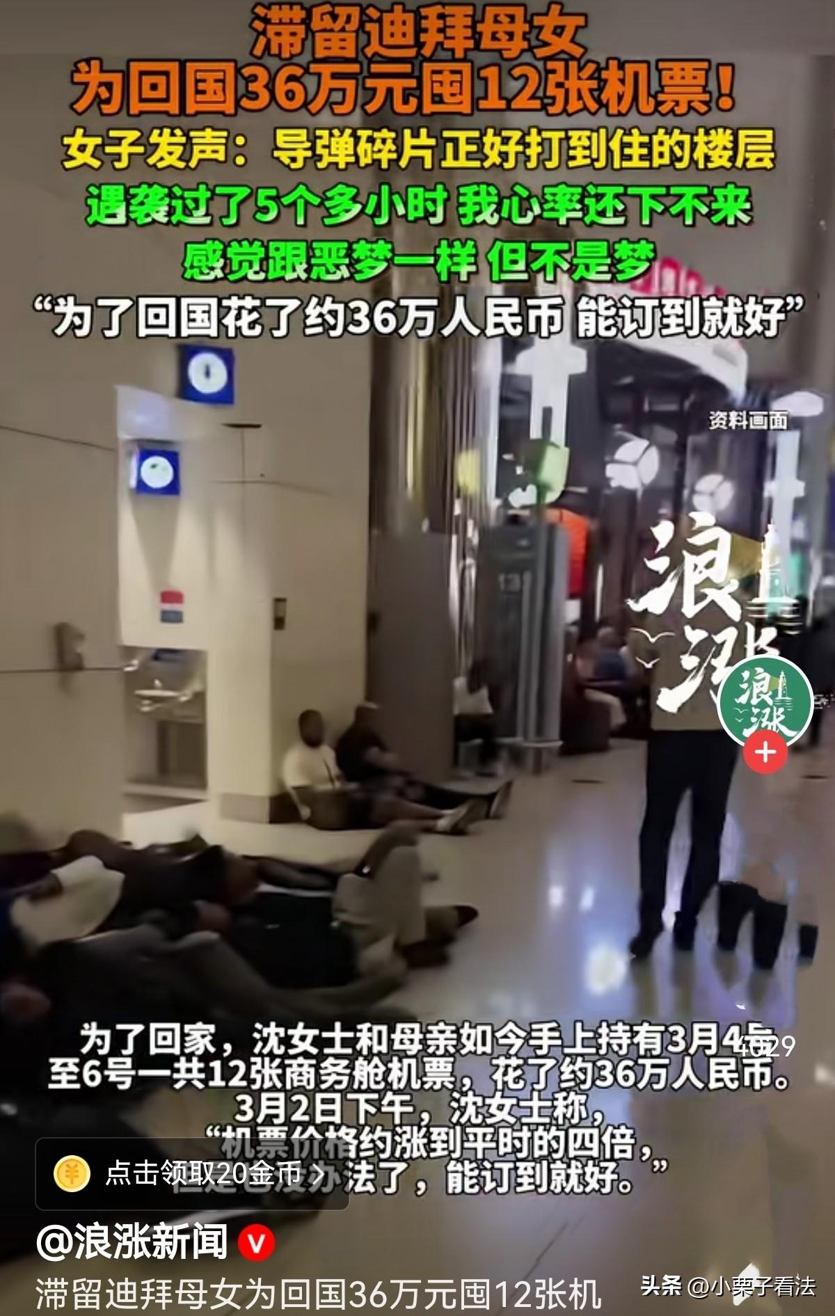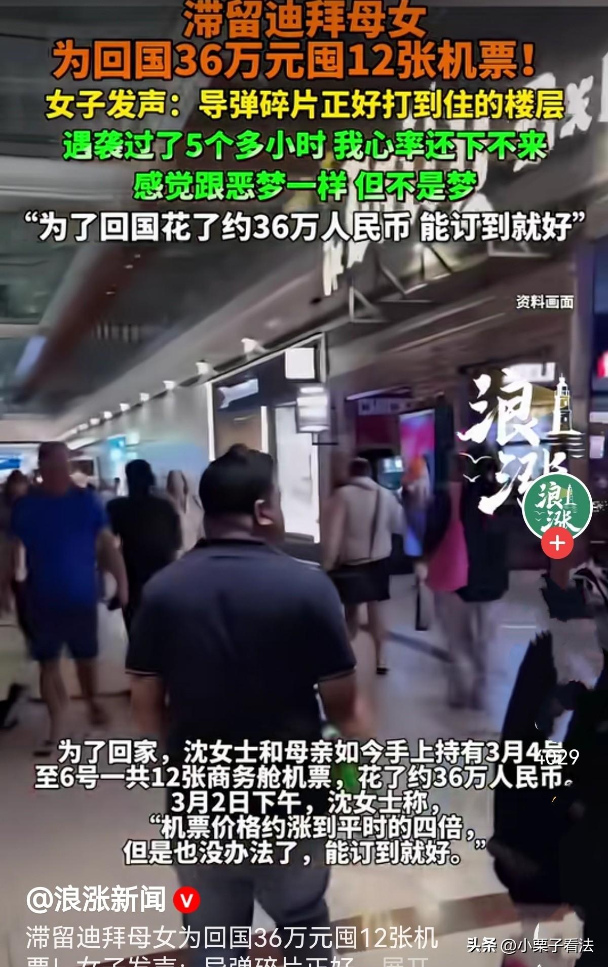 “生死面前,钱是最后的底牌!”女子和母亲在迪拜旅游,原打算3月7日回国,谁知,一导弹碎片打到她住的酒店楼层,把她们吓的魂飞魄散,5个小时心率都缓过来!为了回国,尽管2日时机票已翻了4倍,她豁出去了,花36万买了4-6日两天的12张商务舱票,期待随时能登机启航回国!只要保住命,能订上钱,这会不会算计多少钱了!网友:出国的时候一声不吭,回不来了哇哇大哭! 谁出门旅游,不是抱着开开心心的心情?沈女士也一样。 今年2月27日,她特意带着母亲前往迪拜,打算好好放松几天,看看异国风景,吃点特色美食,然后安安稳稳在3月7日坐飞机回国。 那时候的她们,满心都是期待和轻松,完全想不到,一场突如其来的危险,会把所有美好瞬间打碎。 平静的日子没过几天,意外就从天而降。 那天,刺耳的防空警报突然响起,沈女士整个人一下子就僵住了。 几乎是本能反应,她什么都来不及多想,抓起护照、攥紧钱包,伸手就拉住身边的母亲,拼命往外跑。 行李箱、衣服、日用品、买好的纪念品……所有东西全都扔在了房间里,那一刻,她脑子里只有一个念头:带着妈妈活下去,赶紧离开这里,别的什么都顾不上了。 更让她崩溃的是,事后才知道,导弹碎片,不偏不倚正好砸中了她们住的楼层。 现在回想起来,沈女士依旧控制不住地心慌。遇袭过去5个小时,她的心率还是降不下来,手脚发软,坐立不安。 感觉跟做噩梦一样,但这不是梦,是真真切切发生在自己身上的事。她说这句话的时候,声音都在发抖。 一边是年迈的母亲,一边是近在眼前的危险,作为女儿,她既害怕又自责,只恨自己没能早点带母亲离开这个是非之地。 从导弹落在身边那一刻起,沈女士心里就只有一个想法:立刻回国。 原本3月7日的机票,早就不能指望了。当地局势突变,航班大面积取消、延误,能飞的班次少得可怜,3月2日时机票价格疯涨,直接涨到平时的4倍。 就算贵得离谱,票还是一放出来就被抢空,稍微犹豫几秒,可能就没了。 在这种情况下,沈女士根本不敢赌。为了确保能回家,她开始不停地刷票、订票、改签。 只要有航班放出票,她就立刻下单,不敢有一丝耽误。 3月4日到3月6日两天,她和母亲手里就陆陆续续囤下了12张商务舱机票,前前后后花了大约36万人民币。 36万,对很多家庭来说,都不是一笔小数目。有人可能会说,花这么多钱买机票,太不值了。 可只有身处险境的人,才懂这种心情。在生死面前,钱真的不算什么。 沈女士自己也说:机票价格涨到平时的4倍,但是也没有办法,能订到就好! 能订到,就代表有希望;能订到,就代表她们离回家更近一步;能订到,她才能稍微安心一点,给身边受了惊吓的母亲一点依靠。 这段时间,她们在迪拜度日如年。白天不敢出门,晚上不敢熟睡,一有风吹草动就心惊肉跳。 母亲年纪大了,哪里经历过这种场面,整天忧心忡忡,吃不下、睡不好。沈女士表面上要强装镇定,安慰妈妈:没事,我们很快就能回家!可背地里,她自己也整夜失眠,一边刷着航班信息,一边默默掉眼泪。 出国前有多开心,现在就有多心酸!一场温馨的母女旅行,结果变成担惊受怕的滞留;本来是开开心心看世界,结果差点被危险困在异国他乡。 12张机票,36万块钱,不是奢侈,不是浪费,是一个女儿,在异国他乡,为了保护自己的妈妈,拼尽全力抓住的一条条退路、一份份安全感。 沈女士在发声时,没有抱怨,没有指责,只有藏不住的后怕和强烈的归心。 她们现在唯一的期盼,就是航班能顺利起飞,能平平安安踏上祖国的土地。 有人说,贫穷让我省了好多钱,还不让我担惊受怕!感谢贫穷,也感谢我的祖 国,等我赚到钱,我会走遍我美丽的祖 国! 有人说,本来这机票就紧张。他两个人买12张票,那不是又有10个人回不去了吗? 还有人说,有钱真好!能保命!没钱只能等死!能去那里旅游的都不差钱的,包架飞机也没问题! 外面的世界再繁华,没有平安,都是虚的。 经历过这一次,她们该比谁都明白:一家人整整齐齐、安安全全待在家里,比什么都重要!你说呢? 对此事您怎么看?
