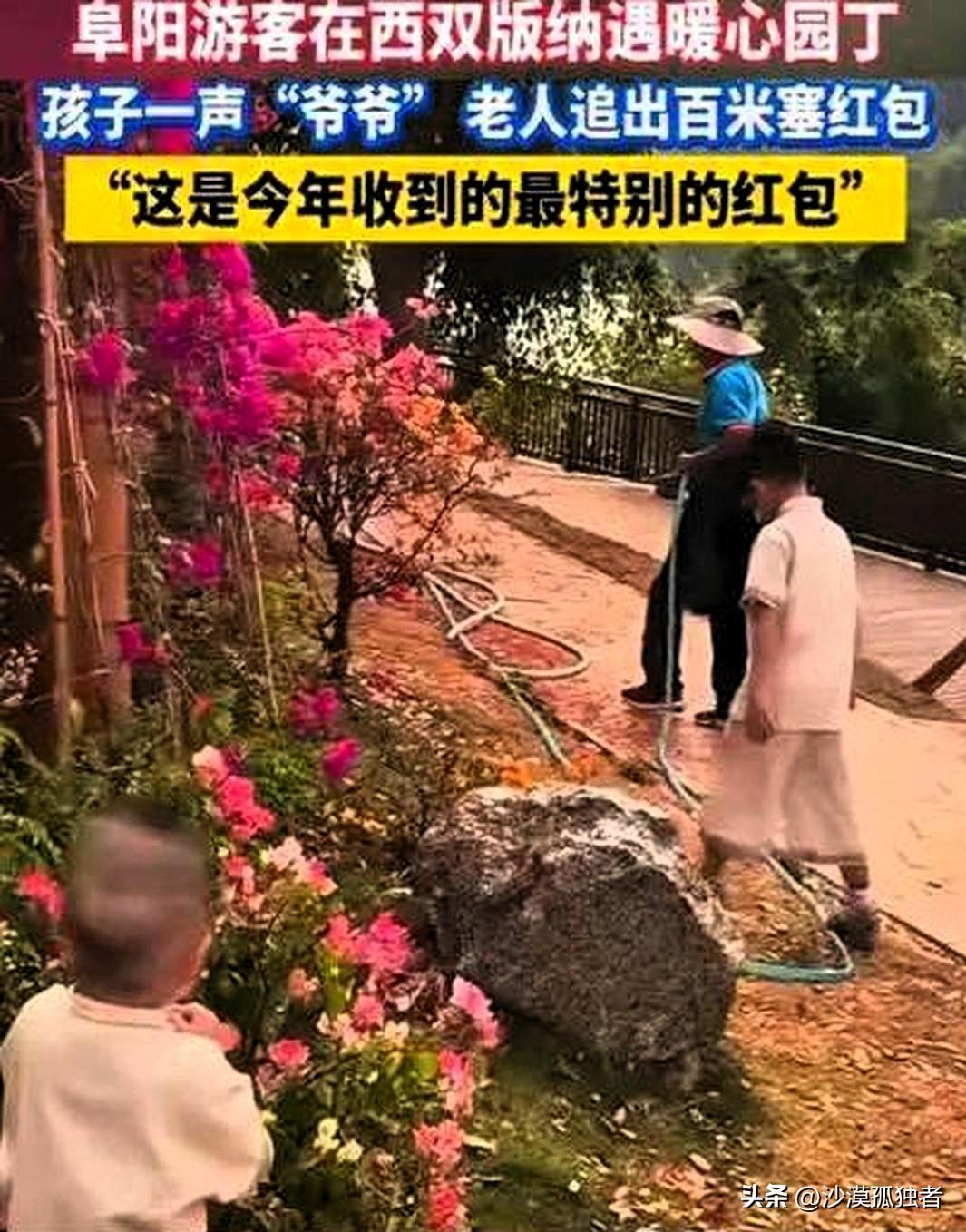 泪目!一位游客的孩子,因为喊了一声酒店门口给花草浇水的园林工“爷爷”,这个爷爷执意要给孩子6元红封,游客不收,园林工的一番话令游客破防:“他喊我爷爷是看得起我!” 一趟跨越千里的家庭出游,往往藏着太多不期而遇的温柔,从安徽阜阳远赴云南西双版纳游玩的一家四口,就亲身经历了一件让他们记一辈子的暖心事,没有华丽的铺垫,没有刻意的煽情,却凭着最朴素的真心,让无数网友看完都忍不住红了眼眶。 事情发生在大年初六,那个时间点选得也好,正是年味还没散尽、人们心里都还揣着点儿柔软的时候。徐女士带着一岁多的小儿子在酒店后花园闲逛,孩子话都说不利索,看见个浇水的老人,张嘴就是一声“爷爷”。这声招呼打得随意,就跟呼吸一样自然。可就是这不带任何目的性的一声,像块石头投进了静水 。 老人当时正握着水管,水还哗哗淌着,他愣了下神,确认孩子是在喊自己,那张晒得黝黑的脸上立刻堆满了笑。接下来的举动谁都没想到——他开始翻自己的布包,掏出一张五块、一张一块,皱巴巴的,攥在手里就往孩子跟前送 。徐女士一开始是懵的,反应过来赶紧推辞,带着孩子往后退。老人不吭声,就那么追着,一趟又一趟,执拗得很。后来才弄明白,老人说这是当地的礼数,孩子开口喊了爷爷,就得给个红封讨个吉利,更何况那天是初六,六块钱,代表着六六大顺,平平安安 。 真正让人心里一颤的,是老人后来补的那句话。因为方言的关系,徐女士听了个大概,但核心意思她听懂了——“他喊我爷爷,是看得起我”。这话从一个六十八岁的园艺工嘴里说出来,分量太重了。重得让那几张皱巴巴的零钱瞬间有了厚度 。我们得想想,老人在这家酒店干了五年,每天弯腰浇水、修剪枝叶,客人们从他身边走过,顶多点个头,更多时候是视而不见。对一个常年处在“透明”状态的人来说,被一个不谙世事的孩子主动亲近、喊作爷爷,那种被尊重、被需要的满足感,可能是我们这些习惯了被礼貌对待的人很难体会的。他不觉得那是孩子随口一叫,他觉得那是孩子“赏”他的脸面。 徐女士最后让孩子收下了,她说再推辞就驳了老人的面子。但她心里过意不去,让大儿子回房间拿了包从安徽带来的烟,追出去老远塞给老人。老人起初死活不要,两边推让了好一会儿,烟才算是送出去 。这来来回回的推让,一点也不难看,反而让人看着暖和。它不是人情世故的客套,是两个陌生人都在小心翼翼地护着对方的好意。后来老人知道徐女士有两个孩子,又掏出一张十块钱想补给老大,徐女士和朋友追了好一阵才把塞回去的钱还给他 。你看,善良这种东西,真的是会传染的,你递过来,我接住,我再送回去,一来一往,谁也不愿意占谁一点便宜,谁也不忍心辜负谁的心意。 网上很多人说这是“爱的双向奔赴” 。这话没错,但我更愿意把它看作一种久违的“看见”。我们活在一个效率至上的时代,人和人的交往往往止步于功能性的寒暄。送快递的、修管道的、浇花的,我们习惯用职业标签去定义他们,却很少把他们当成某个具体的长辈、某个家庭的父亲。可孩子不同,孩子的眼睛还没被世俗的滤镜污染,他们看见的就是一个慈眉善目的爷爷。正是这种最原始的、不带功利的“看见”,戳中了老人心里最软的那块地方,也顺带戳中了屏幕前成千上万个我们。 说到底,这六块钱能买什么?买不了一杯奶茶,买不了一碗米线。但它买得到一份沉甸甸的认可。老人那句“看得起我”,某种程度上是一种提醒。它提醒我们,真正的教养和善意,跟身份地位没关系,它藏在那个愿意蹲下来和孩子平视的动作里,藏在那个从破布包里翻出零钱的坚持里,也藏在那句“平平安安、顺顺利利”的朴素祝福里。比起那些宏大的叙事,这种来自陌生人的、不求回报的温柔,才是生活里真正的光。 各位读者你们怎么看?欢迎在评论区讨论。 信息来源:大皖新闻