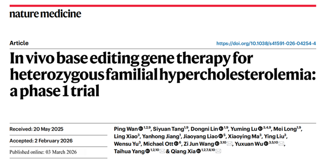 今天,上海交通大学医学院附属仁济医院发表重磅科研成果,中国工程院院士、仁济医院院长夏强领衔的团队,在国际顶尖学术期刊《自然・医学》(NatureMedicine)发表全球首个运用肝脏靶向体内碱基编辑技术治疗杂合子家族性高胆固醇血症的Ⅰ期临床试验结果。这一研究首次在人体中证实了该基因治疗手段的安全性和有效性,为这一遗传代谢性肝病患者摆脱终身用药负担带来全新希望。