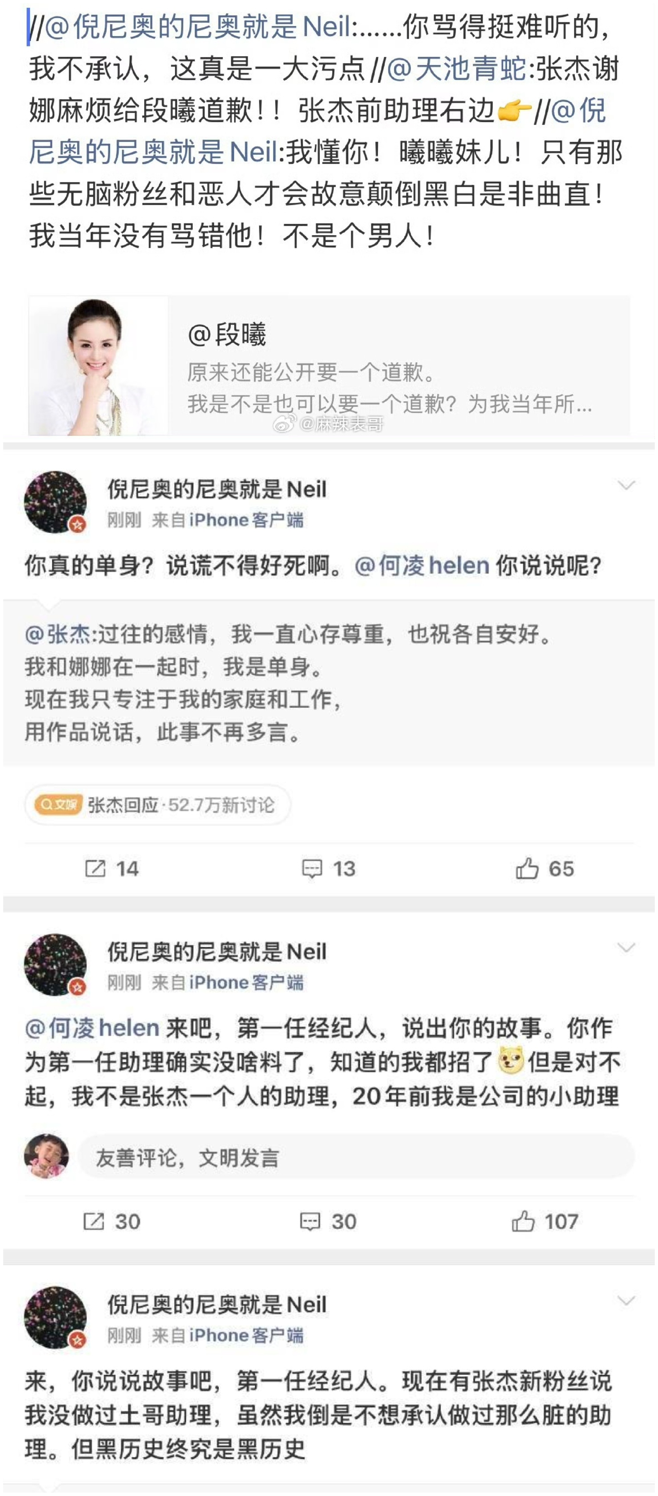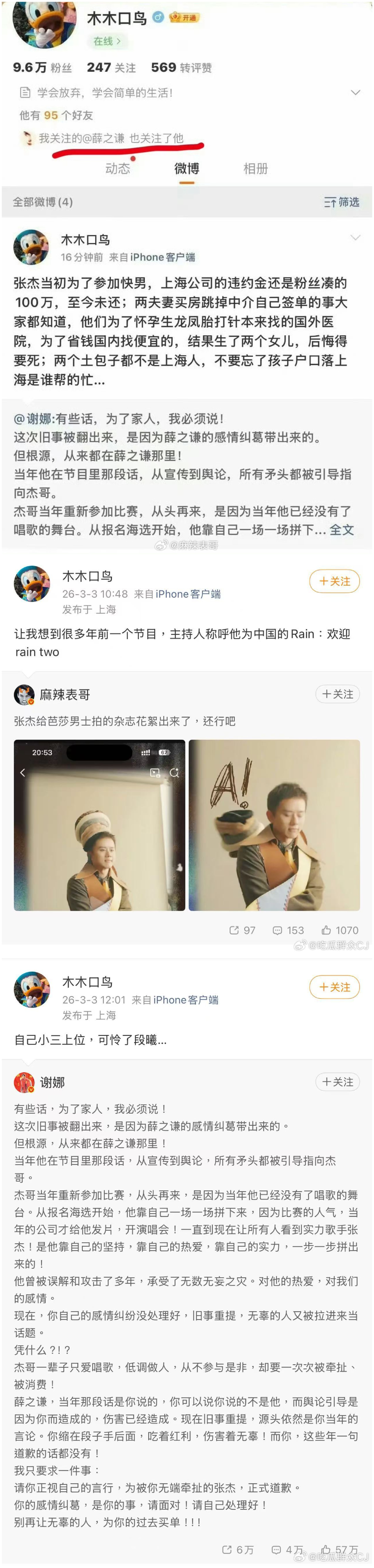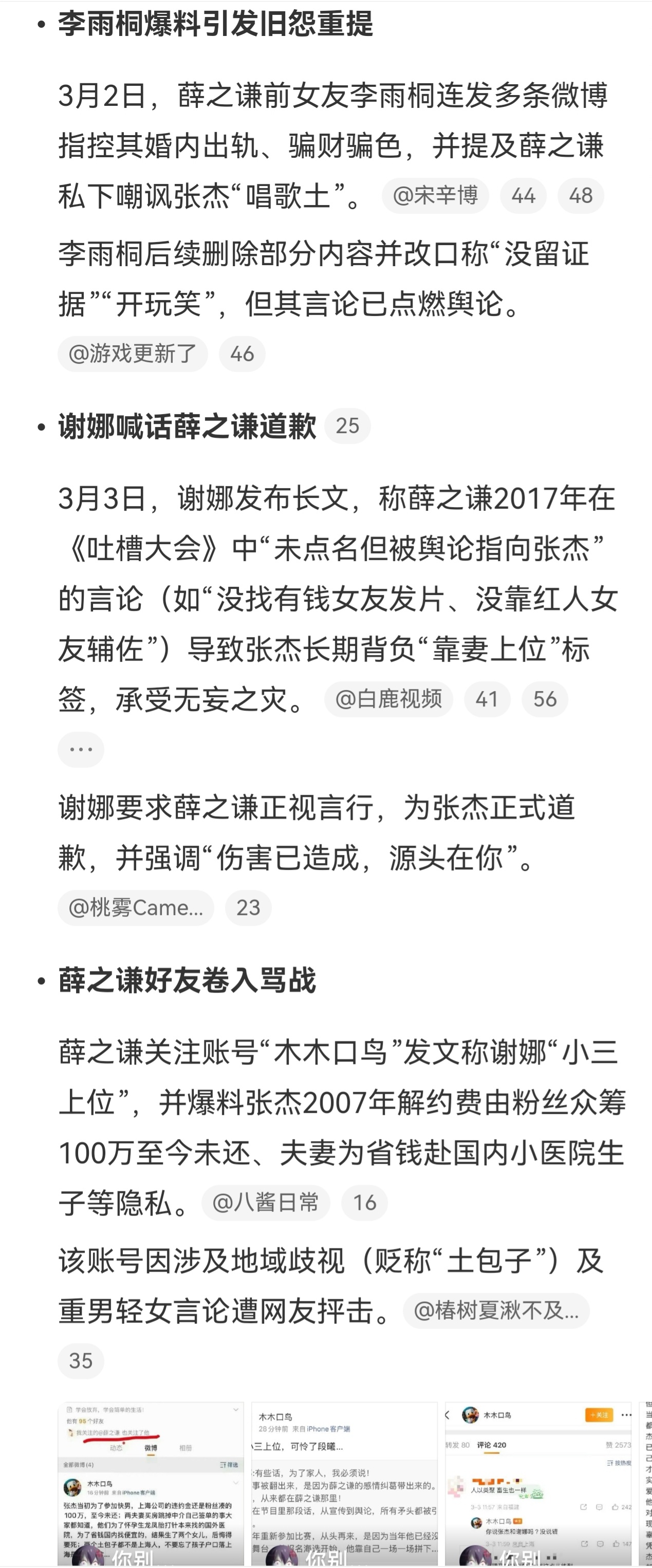薛之谦,李雨桐,张杰,谢娜,段曦①李雨桐连发多条,再控诉薛之谦婚内出轨,私底下说张杰唱歌土 图1②谢娜发长文要求薛之谦道歉(多年前薛在吐槽大会上内涵张杰 图3)图2③薛之谦的好朋友、朱桢以前经纪人转发了谢娜微博,把谢娜张杰的黑料都复述了一遍,说张杰是闰土,骂谢娜是小三 图4④薛之谦所属经纪公司“潮石音乐”发布严正声明,指出李雨桐近期关于“薛之谦贬低张杰”“选妃”等内容纯属捏造对话、恶意诽谤,严重侵害薛之谦合法权益。图5⑤张杰前女友段曦发长文也要求张杰谢娜道歉,被出轨被污蔑小三被冤枉打人,张杰一无所有的时候跟了他,被抛弃想自杀被薛之谦救了,薛之谦义气不解约养公司小弟小妹 图6⑥张杰发文,否认出轨,跟谢娜在一起时是单身 图7⑦我型我秀的制作人转发段曦文,说薛之谦对兄弟义气,不管他对异性相处方式如何 图8⑧张杰前任助理站队薛之谦,说张杰就是出轨了,薛之谦义气 图9网友扒出其也给薛之谦当过助理,且也是上腾公司的员工 图10⑨张杰第一任经纪人发微博力挺薛之谦“老薛人很好,够义气!” 张杰粉认为其之前是上腾公司的,利益站队 图11