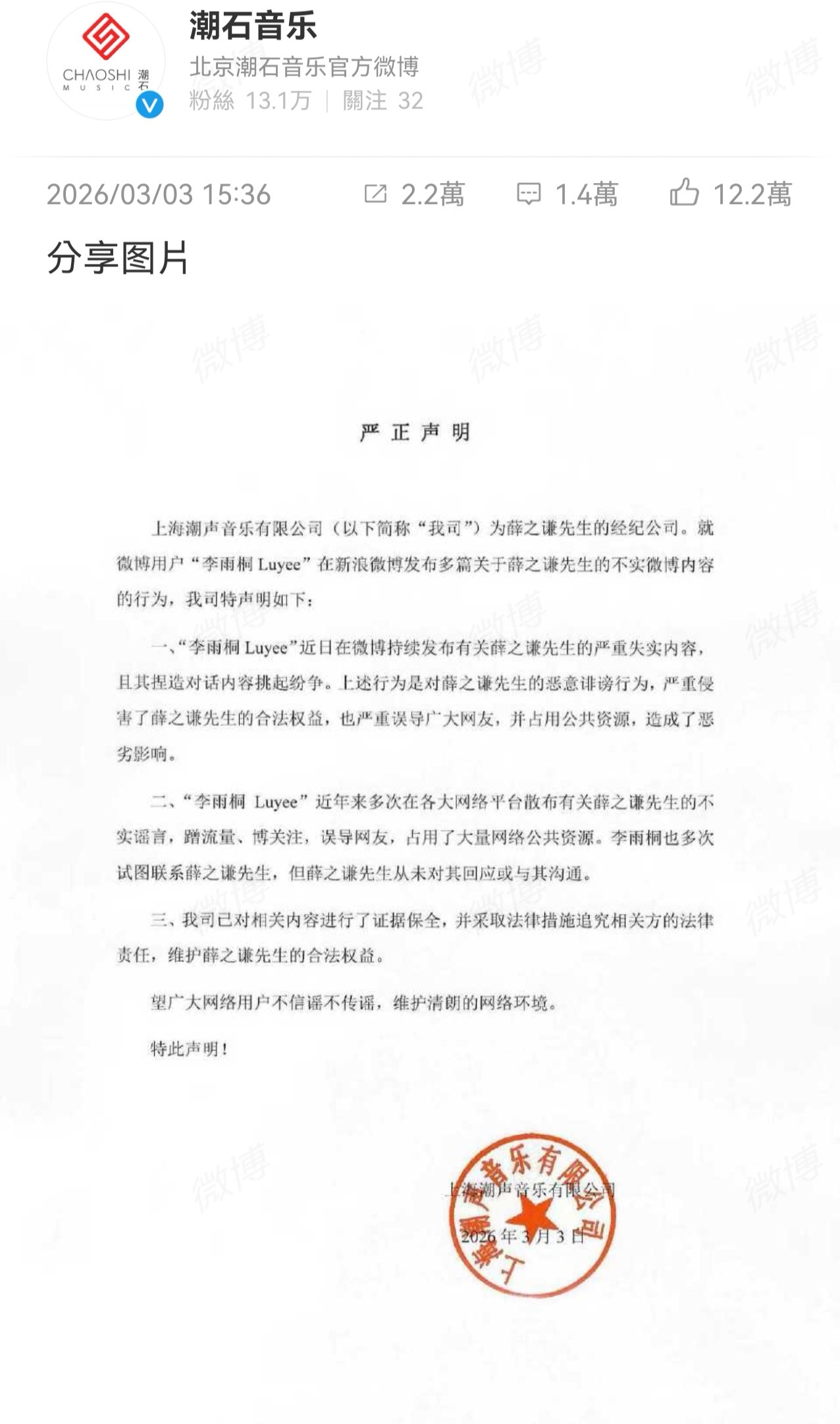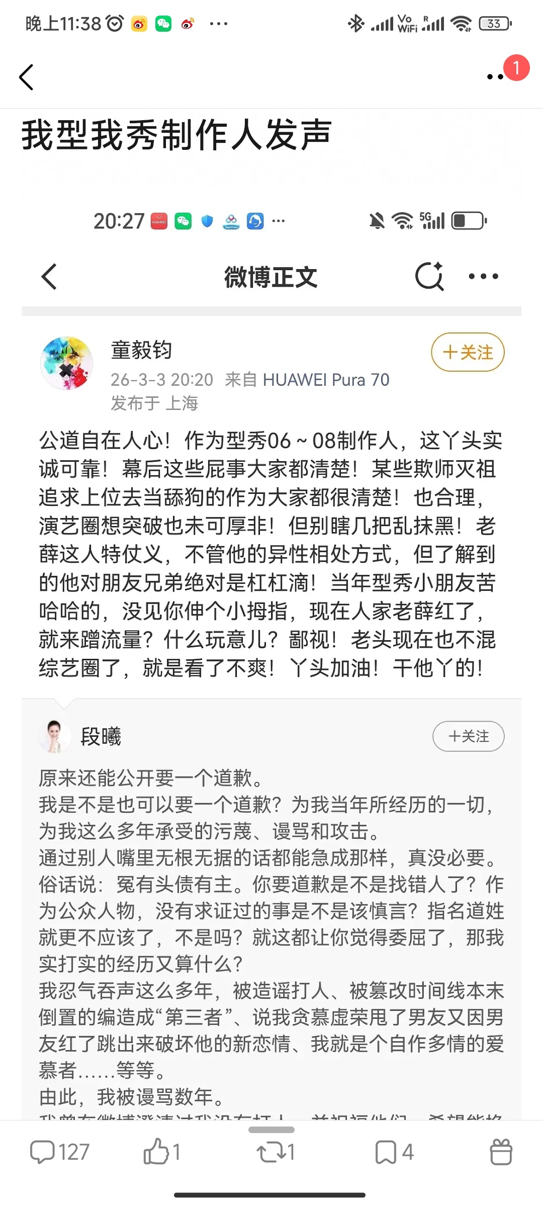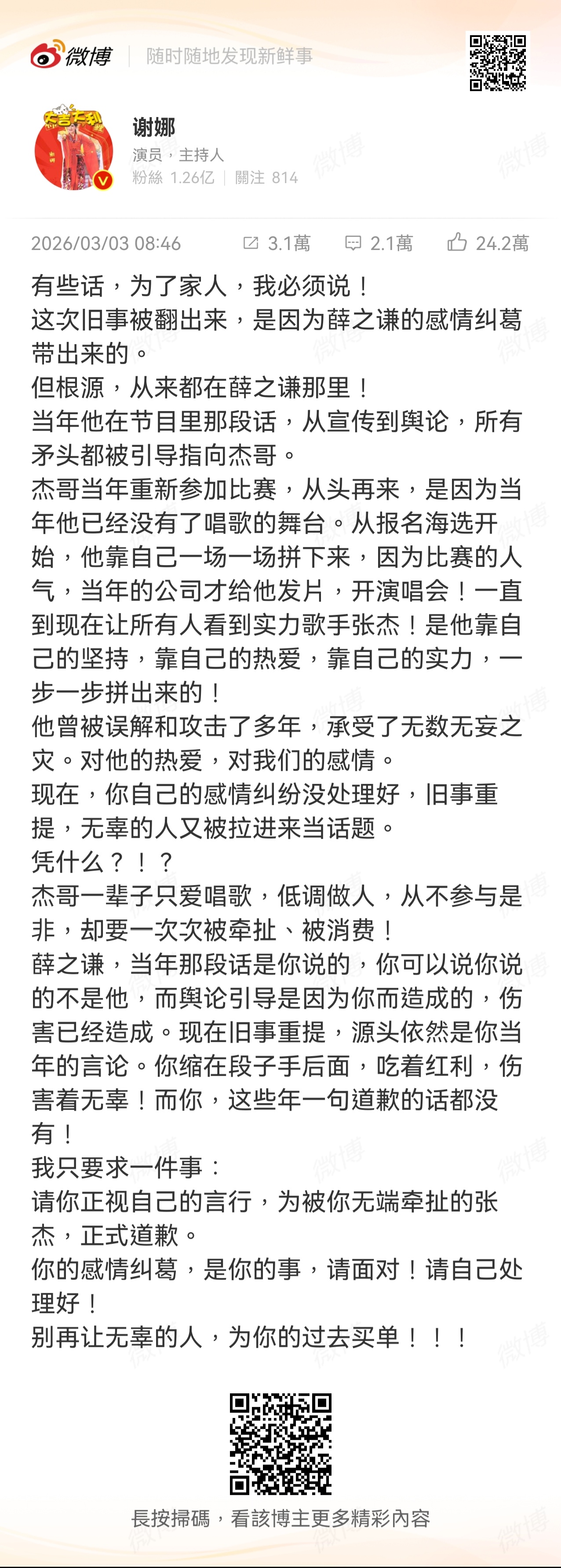 薛之谦,李雨桐,张杰,谢娜,段曦①李雨桐连发多条,再控诉薛之谦婚内出轨,私底下说张杰唱歌土 图1②谢娜发长文要求薛之谦道歉(多年前薛在吐槽大会上内涵张杰 图3)图2③薛之谦的好朋友、朱桢以前经纪人转发了谢娜微博,把谢娜张杰的黑料都复述了一遍,说张杰是闰土,骂谢娜是小三 图4④薛之谦所属经纪公司“潮石音乐”发布严正声明,指出李雨桐近期关于“薛之谦贬低张杰”“选妃”等内容纯属捏造对话、恶意诽谤,严重侵害薛之谦合法权益。图5⑤张杰前女友段曦发长文也要求张杰谢娜道歉,被出轨被污蔑小三被冤枉打人,张杰一无所有的时候跟了他,被抛弃想自杀被薛之谦救了,薛之谦义气不解约养公司小弟小妹 图6⑥张杰发文,否认出轨,跟谢娜在一起时是单身 图7⑦我型我秀的制作人转发段曦文,说薛之谦对兄弟义气,不管他对异性相处方式如何 图8⑧张杰前任助理站队薛之谦,说张杰就是出轨了,薛之谦义气 图9网友扒出其也给薛之谦当过助理,且也是上腾公司的员工 图10⑨张杰第一任经纪人发微博力挺薛之谦“老薛人很好,够义气!” 张杰粉认为其之前是上腾公司的,利益站队 图11
