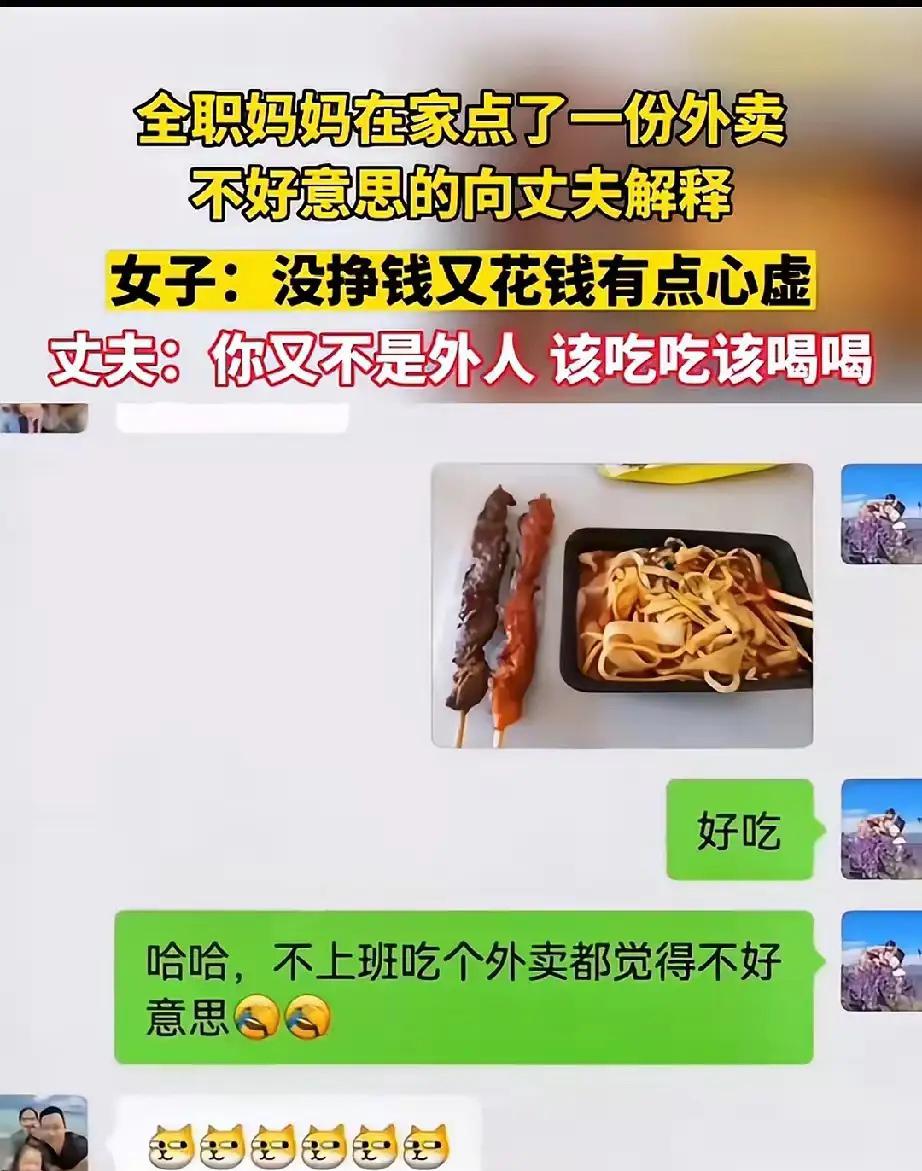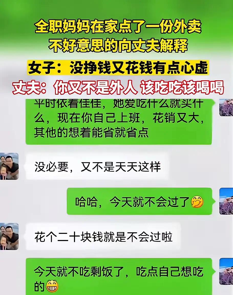 这或许是夫妻相处最佳模式了,女子分享了自己在家做全职妈妈,没有收入,全靠丈夫供养。有一次做完家务过了饭点,女子就给自己点了一份外卖,但点完后又有点怕丈夫责怪乱花钱。然后不好意思的拍照告知老公自己点了外卖,希望丈夫不要责怪。 可看完这段文字,我丝毫没感受到所谓的最佳相处模式,反倒只品出了全职妈妈藏在细节里的心酸与卑微。很多人对全职妈妈的生活有着天然的误解,觉得不用上班、不用应对职场人际关系,就是清闲享福,只有真正身处这个角色的人,才知道这份没有薪资、没有假期、24小时随时待命的生活,有多消耗人。 女子不是贪图省事不愿做饭,是被无休止的家务占满了时间,擦完灶台、收拾完客厅、打理好家里的杂物,抬头才发现早已过了正常饭点。她只是想简单填一下肚子,不过是点了一份最普通的外卖,却要在做完之后心怀愧疚,拍照跟丈夫报备,还提前恳求对方不要责怪,这份小心翼翼的姿态,根本不是平等夫妻该有的模样。 在大多数家庭的认知里,丈夫在外赚钱,就是家庭的核心贡献者,而全职妈妈在家的所有付出,都被归为“理所应当”。没人会计算每天重复的家务需要耗费多少精力,没人会在意带孩子时连完整喝口水的时间都没有,更没人把这份隐形的家庭劳动,换算成对等的价值。当女性失去独立的经济收入,所有的生活开销都要依靠伴侣时,哪怕是再小的一笔支出,都会让她不自觉地产生愧疚感。 这份愧疚不是女子小题大做,而是长期经济不独立催生的不安全感。现实里太多全职妈妈都有过同款经历,买生活用品时要反复比价,给自己添一件小东西要犹豫半天,甚至连生病去医院,都要先斟酌会不会被说浪费钱。她们为了家庭放弃了职场发展,放弃了社交圈子,把所有时间都奉献给家人,最后却连坦然消费的底气都没有。 真正健康的夫妻关系,从来不是一方单方面供养另一方,更不是一方在关系里低头讨好、谨小慎微。婚姻是两个人的并肩前行,丈夫在外奔波赚钱是付出,妻子在家操持家务、照顾家庭同样是付出,两者没有高低贵贱之分。女子为家庭付出的时间和心力,远比一份外卖的价值更重,她本就不需要为这样一件小事道歉。 大家之所以会被这件事触动,就是因为戳中了无数全职妈妈的痛点。所谓的最佳相处模式,不该是建立在女性的隐忍和卑微之上,而是彼此尊重、互相体谅。丈夫能看见妻子操持家庭的辛苦,妻子能理解丈夫在外打拼的不易,即便一方暂时没有收入,也能理直气壮地享受家庭的成果,不用因为钱而看任何人的脸色。 我们不该美化这种带着不安的相处状态,反而该正视全职妈妈的价值,每一个为家庭舍弃自我的女性,都该被珍视、被尊重,都该拥有无需小心翼翼的底气。 各位读者你们怎么看?欢迎在评论区讨论。