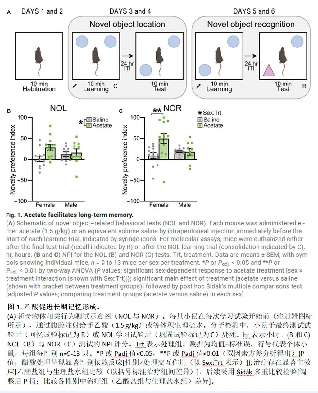 研究人员给小鼠注射醋酸盐,然后让它们完成物体识别任务。结果令人惊喜:雌性小鼠的表现突飞猛进,对物体的位置和新旧记得清清楚楚。而雄性小鼠?几乎没啥变化。