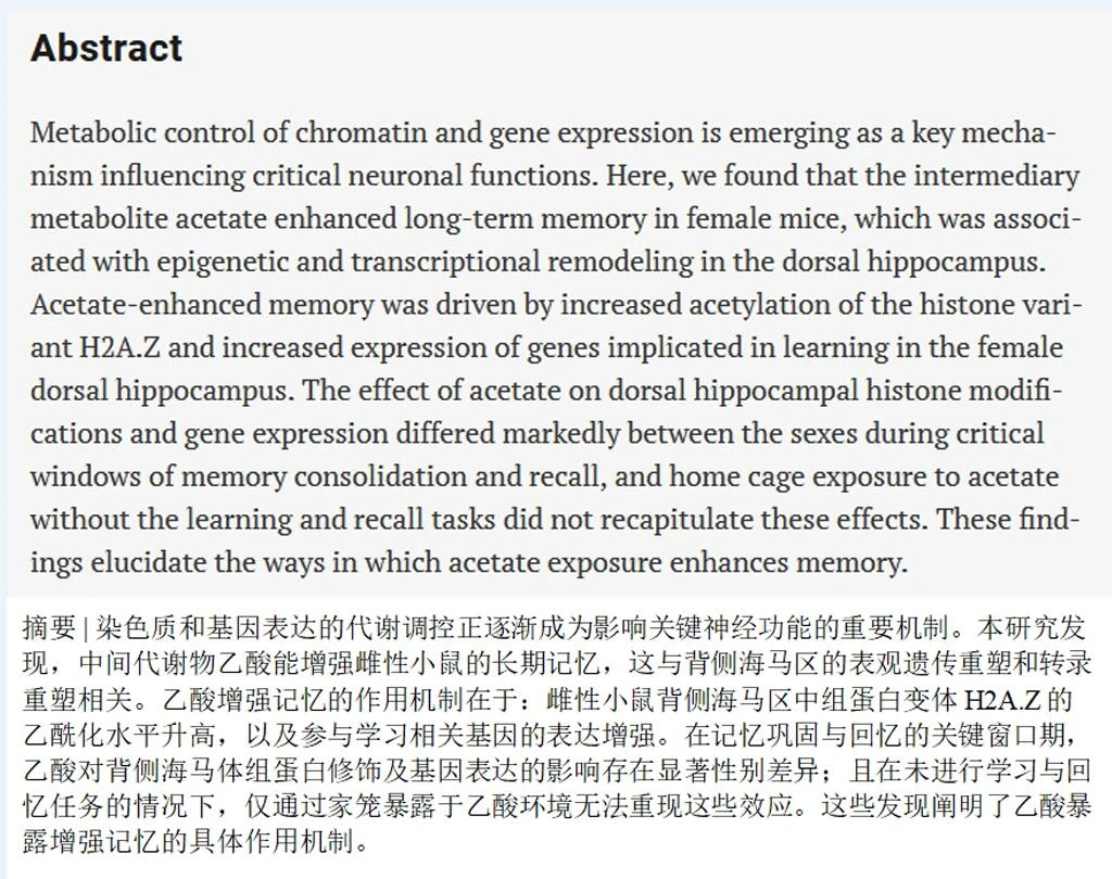 在雌性海马体——大脑的记忆中枢,醋酸盐像一把钥匙,开启了特定的表观遗传开关。一种叫H2A.Z的组蛋白被悄悄乙酰化,原本紧闭的染色质松开了,与学习记忆相关的基因开始活跃表达。尤其是那个叫Nr4a3的基因,它的活跃程度飙升,而这个基因正是记忆形成的核心调控者。