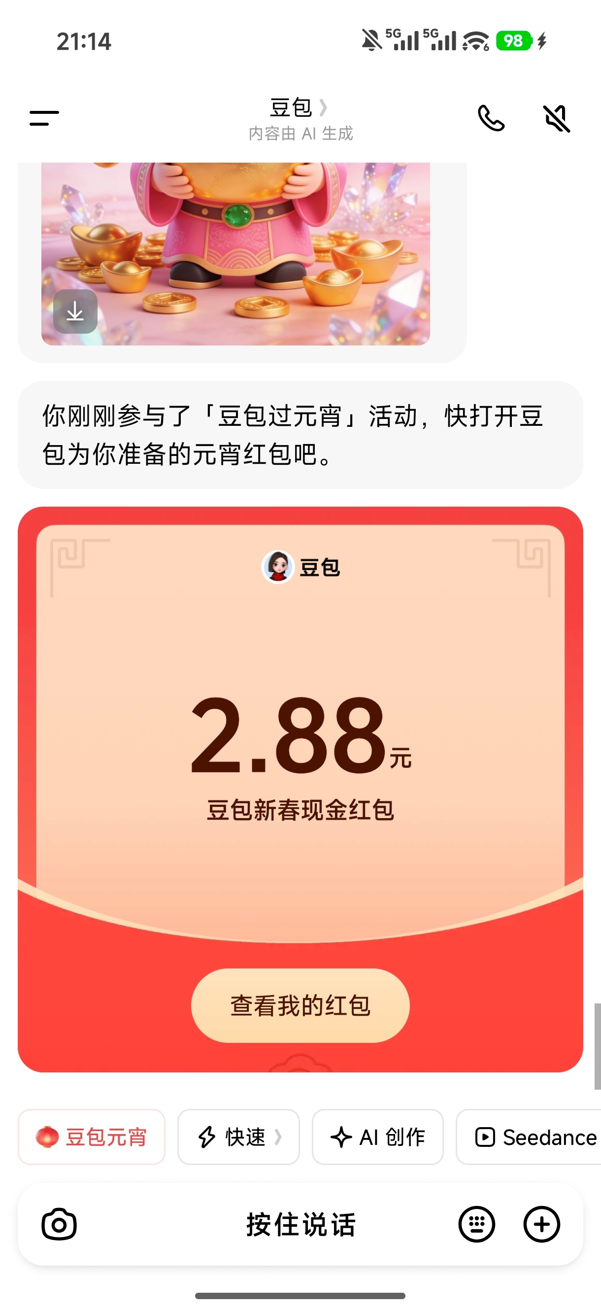 元宵红包豆包给我2块八毛八。比过年的时候多了整整一块钱!
