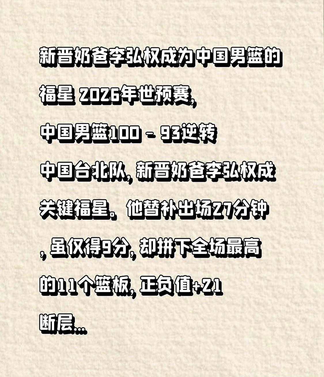 末节落后11分,中国男篮靠一个奶爸和一条拉伤的大腿翻盘。 第三节结束哨响,记分牌定格在66-77。场边替补席没人说话,毛巾盖住了半张脸。朱俊龙刚投进第五记三分,落地时左腿突然一软,直接被搀出场外。更衣室里他咬着牙说“不用拍核磁”,转身却扶着墙走了三步才站稳。 谁能想到,顶上来的是李弘权——女儿出生那天他还在训练馆加练。末节他抢下4个前场篮板,罚球线两次稳稳命中,最后30秒封盖林庭谦的上篮,落地时吼得脖子青筋暴起。全场最高+21正负值,不是数据,是当爹的人把思念砸进了篮筐。 赢球后郭士强没提战术,只让他赶紧回家抱孩子。可球迷都在问:这种硬仗,为什么总要等到有人受伤、有人当爹,才打得出来?