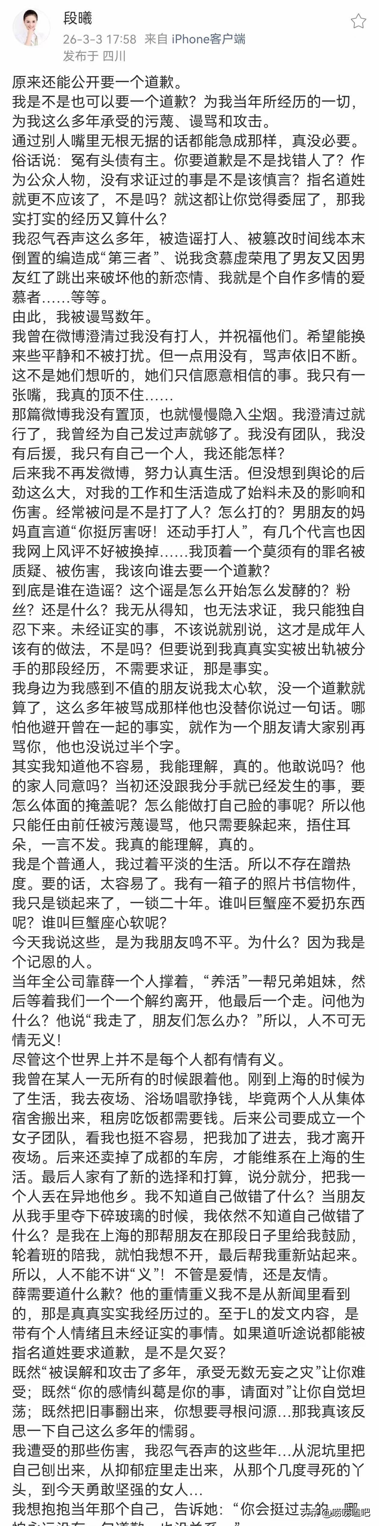 张杰前女友,曝出猛料! 3月3日,张杰前女友段曦,突然写下千字长文,诉说多年来的委屈与困扰。 薛之谦和李雨桐的舆论风波还未平息,张杰的前女友段曦突然发布一篇千字长文,引发网友关注。 段曦与张杰早年因节目相识,两人确实有过一段公开的恋情,这是双方都不曾否认的事实。 在那段不为人熟知的岁月里,两人都处在事业起步阶段,彼此陪伴走过一段青涩时光。 段曦在长文中表示,多年来自己一直承受着网络谣言带来的压力,生活受到不小影响。 她最在意的,是多年来被强加在身上的不实指责,这些传言让她背负了不该有的骂名。 对于网络上流传多年的极端负面说法,段曦多次进行过澄清,她强调,自己从未做过那些被恶意编造的行为,只是谣言传播太久,让她百口莫辩。 这些年,她默默承受着舆论带来的伤害,事业与生活都受到不同程度的波及。 在她看来,自己只是一段过去感情里的普通人,却被长期卷入不必要的争议中。 段曦此次发声,更多是想为自己澄清,还原被歪曲多年的个人形象。 她希望外界能够停止传播不实信息,还给自己一份应有的清净与尊重。 感情的开始与结束,本就是两个人之间的私事,外人很难完全知晓全貌。 当年的是非对错,早已随着时间远去,没有必要再被反复拿出来过度解读。 公众人物的过往被关注很正常, 但每个人都该被尊重,无论是否还在大众视野里,都不该被谣言伤害。 各位读者你们怎么看?欢迎在评论区讨论。