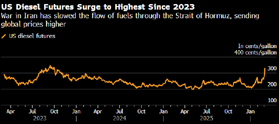 全球柴油价格飙升至多年高位,针对伊朗的战争在中东地区蔓延,导致本就供应趋紧的市场面临更大压力。