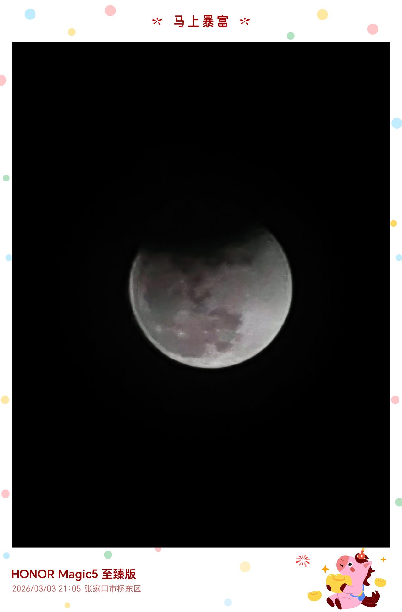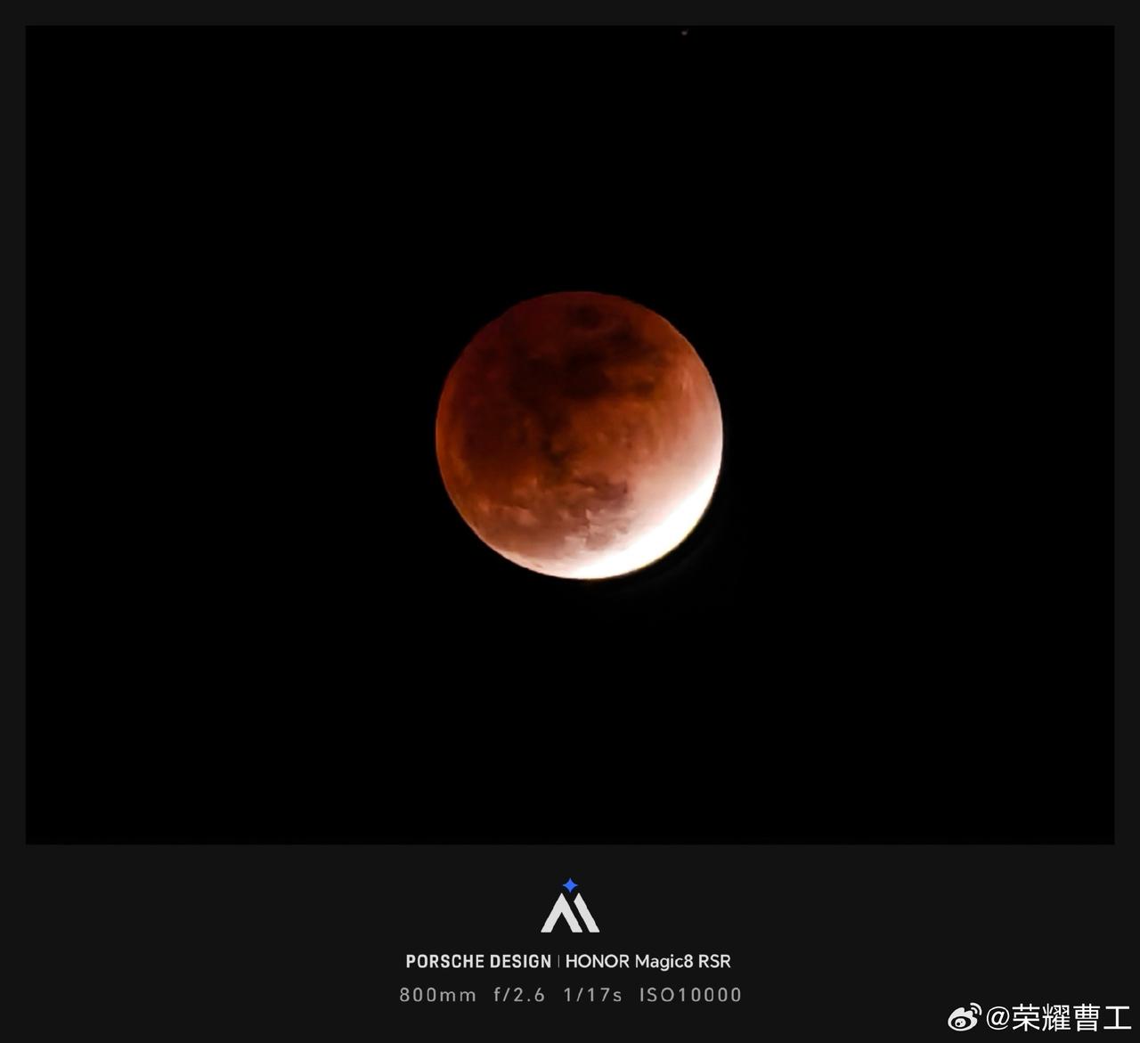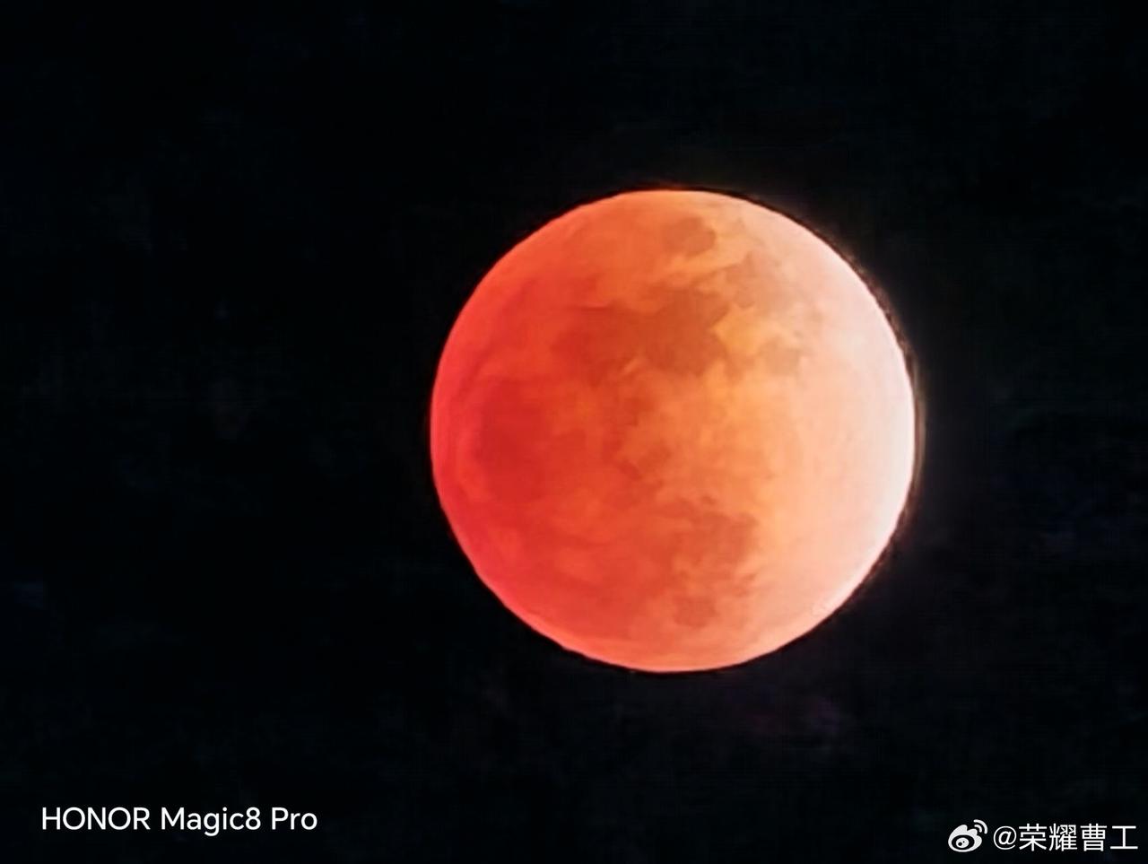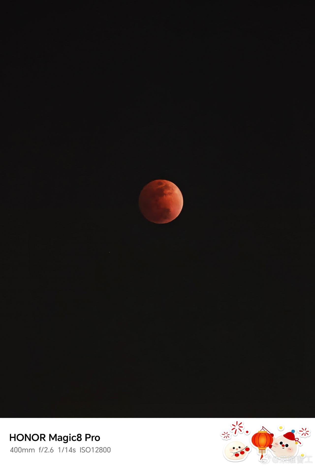 假期过的还是非常快,正月十五元宵节正好遇上了月全食,而且还会出现红月现象,刚刚看到荣耀研发工程师曹工,分享了小伙伴们利用荣耀手机拍摄的月亮,当然我也拍摄了一张,当时吃饭没有追上红月,MagicOS相机水印元宵节主题,也是蛮能够烘托节日氛围的,我的荣耀手机感觉还能再战几年 畅聊数码新品 数码资讯