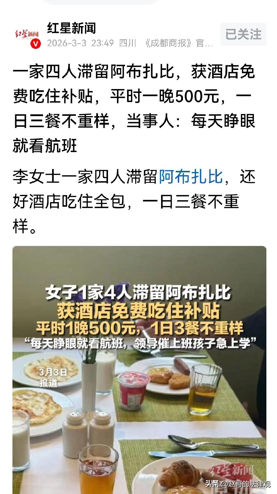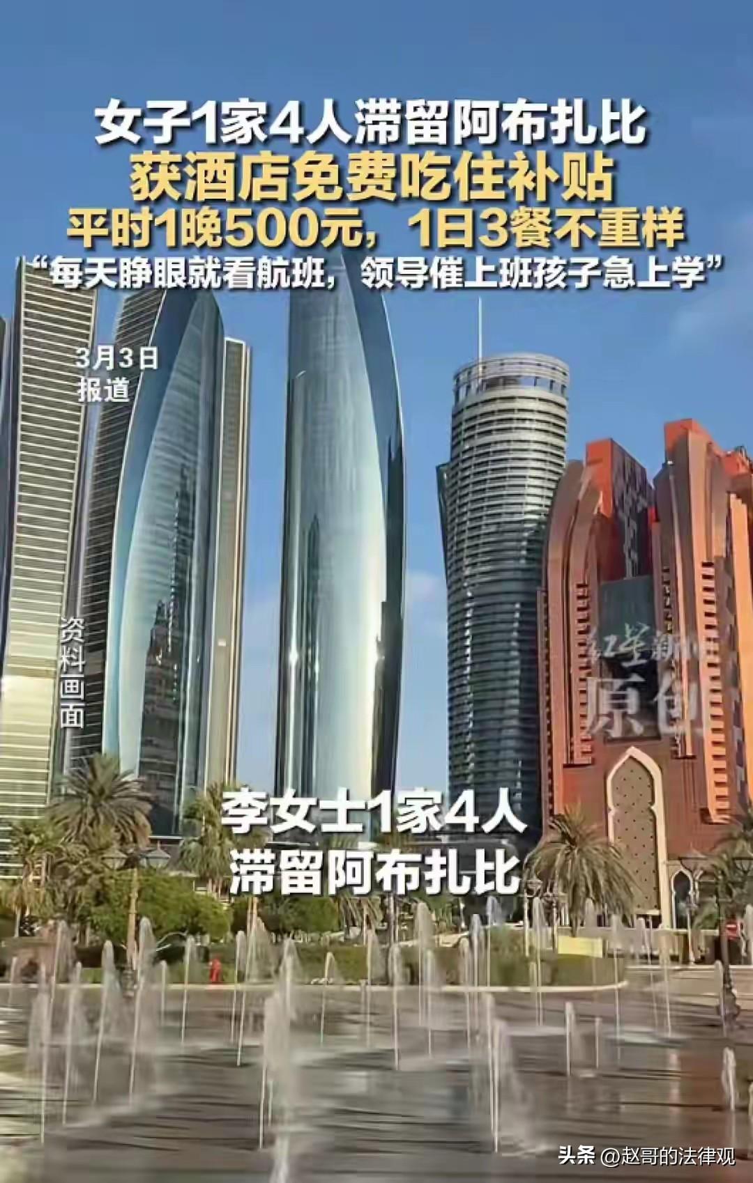 阿布扎比当地一家酒店里,李女士一家4口,获得酒店免费吃住补贴,平时一晚500元,一日三餐不重样。自2月28日晚上,航班被取消到现在,他们已经在阿联酋首都待了四五天,她们还在盼着能回家的那天。 李女士是带着家人出国游玩,本来计划得好好的, 打算2月28号晚上,坐飞机回国。 结果,那天伊朗遭到了袭击,中东这边一下子就紧张起来了。 当天晚上,她就收到了航班取消的通知,一家4口就这么被滞留在阿布扎比,走也走不了。 刚知道航班没有了的时候,人肯定是懵的。 但更麻烦的是找地方住。那几天局势紧张,阿联酋这边很多航班都停了,一下子有两万多名旅客堵在这儿 。 阿布扎比和迪拜的酒店全是人,李女士拿着手机刷了很久很久,才好不容易找到一家还有房间的酒店。 这酒店平时价格也不算贵,平常一晚大概500块人民币左右。 住进去以后,倒是有一个好消息。 阿联酋后来发了通知,说因为这种特殊情况走不了的旅客,住宿费由他们来承担 。 李女士跟前台协商了一下,意外的是,还挺顺利的,不光房费免了,酒店还管一日三餐。 他们的心一下子踏实了,这下子吃住都不用发愁了。 而且饭菜也挺实在,水果、沙拉、披萨、意面,每天换着花样来,不带重样的。 孩子无聊了还能去健身房跑跑步、锻炼,出出汗。 虽然吃住都解决了,但心里那根弦还是紧绷着。 李女士最着急的倒不是自己,是家里的两个孩子。 大的那个今年上初二,学业正是最紧张的时候,学校那边已经开学了,课落下了可不是那么好补的。 小的也需要人照顾。她自己单位那边,领导也问了好几回,到底啥时候能回来上班。 人在国外,工作上的事儿、上学的事儿只能干着急。 这几天,李女士养成了个习惯,每天睁开眼第一件事,就是摸出手机看航班信息。 看看有没有新的消息,看看自己买的票还作不作的数。 经过好几轮折腾和改签,她好不容易抢到了3月7号回北京的机票。 票是攥在手里了,但她心里还是没底。 毕竟现在这边的情况,说变就变,谁也不敢保证7号那趟飞机就能顺顺利利地起飞。 人在异国他乡,又是这么个特殊时候,说不焦虑那是假的。 虽然酒店里啥都有,服务也挺好,但毕竟不是自己家。 李女士现在就盼着日子能过快点,平平安安到7号,一家人能按时登上飞机,早点回家。 只要飞机没落地,这颗心就一直安稳不下来。 不过从这件事里,我们能看到几个层面的现实与无奈。 极端环境下的生存本能:在局势失控的背景下,“回家”成了压倒一切的刚需。 在航班随时可能取消,而在恐惧和不确定面前,对生命和安全感的极度渴望。 突发事件中,普通游客往往是最脆弱的群体,既无法预判局势,也难以获得官方的优先撤离通道,只能在混乱的市场里用高价”抢票”。 凸显了在海外遇到危机时,个人力量的渺小,以及对国家领事保护和应急响应的迫切需求。 还有对“安全溢价”重新认知,平时我们觉得机票是“消费品”,但在战乱和动荡中,它成了“逃生船票”。 也让我们更直观地感受到和平的可贵,以及祖国强大对海外公民的重要。 《领事保护与协助条例》第十五条:驻在国发生战争……等重大突发事件,在国外的中国公民、法人、非法人组织因人身财产安全受到威胁需要帮助的,驻外外交机构应当及时核实情况,敦促驻在国采取有效措施保护中国公民……人身财产安全,并根据相关情形提供协助。 伊朗遭到袭击,导致中东局势紧张,李女士一家因航班取消滞留在阿布扎比。 虽然文中未提及,我国驻外外交机构在此事件中的具体行动。 但根据该条款,我国驻外外交机构有职责核实李女士等滞留游客的情况,敦促阿联酋采取措施保障他们的人身财产安全。 如果有必要且条件允许,外交机构还应协调各方为他们提供协助,比如协助解决住宿、返程等问题。 让海外中国公民在遇到危机时能感受到祖国的支持,增强安全感和归属感。 也体现了国家维护公民正当权益的责任与担当。 有人说,李女士一家四口,这回可见了大世面了,大人孩子回国后肯定有的炫耀了。 对此你怎么看? 关注@赵哥的法律观,欢迎评论区发表您的看法。