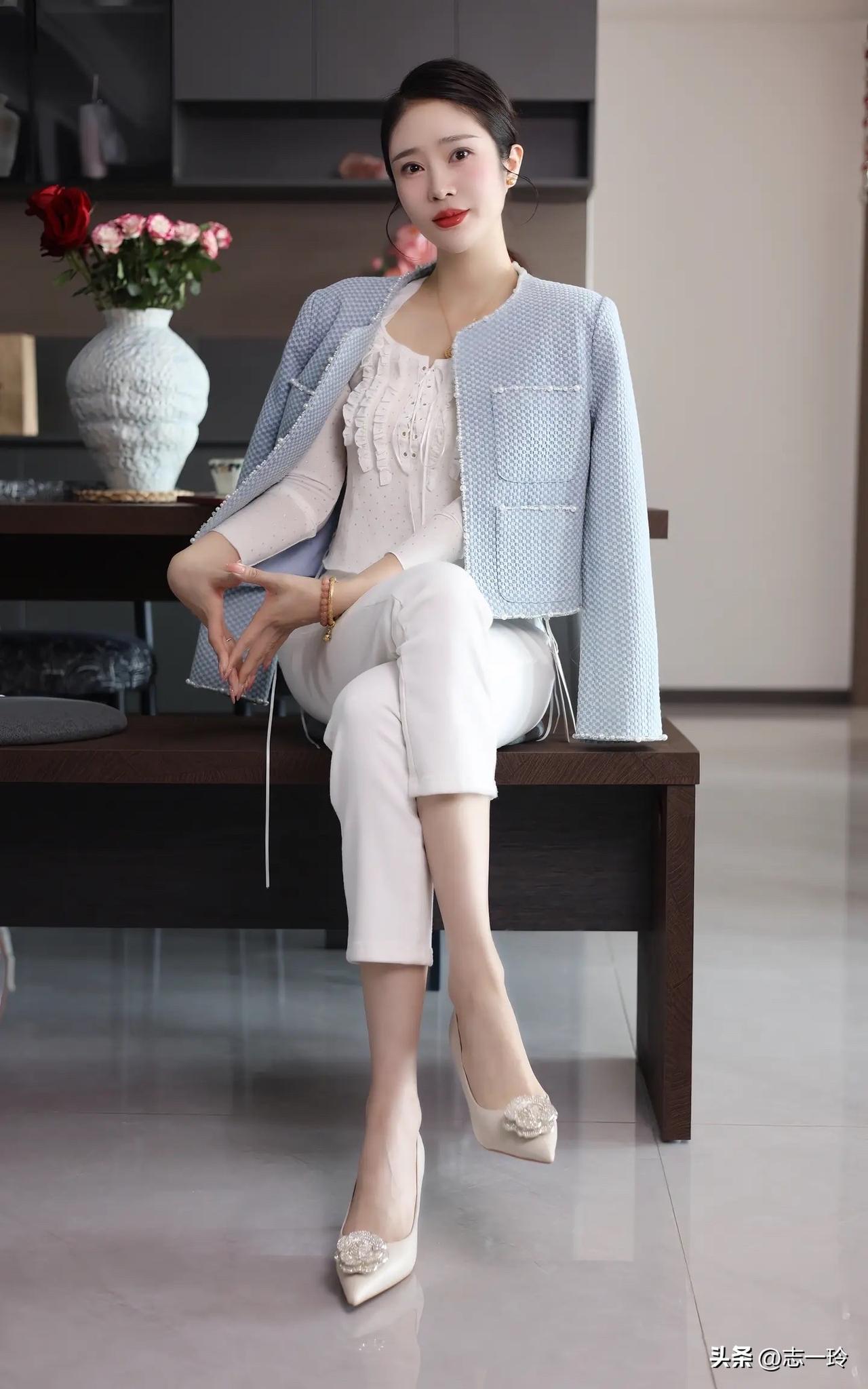 优雅气质穿搭,浅蓝色西装外套搭配白色套装,尽显知性美!