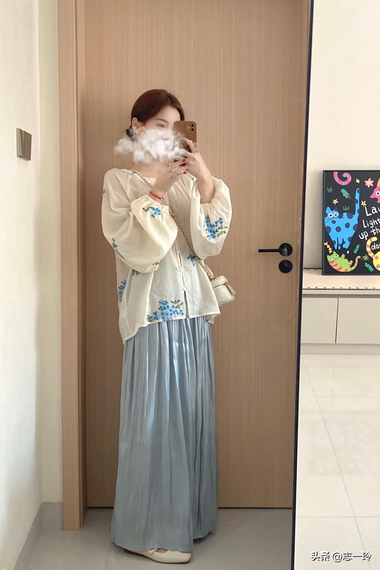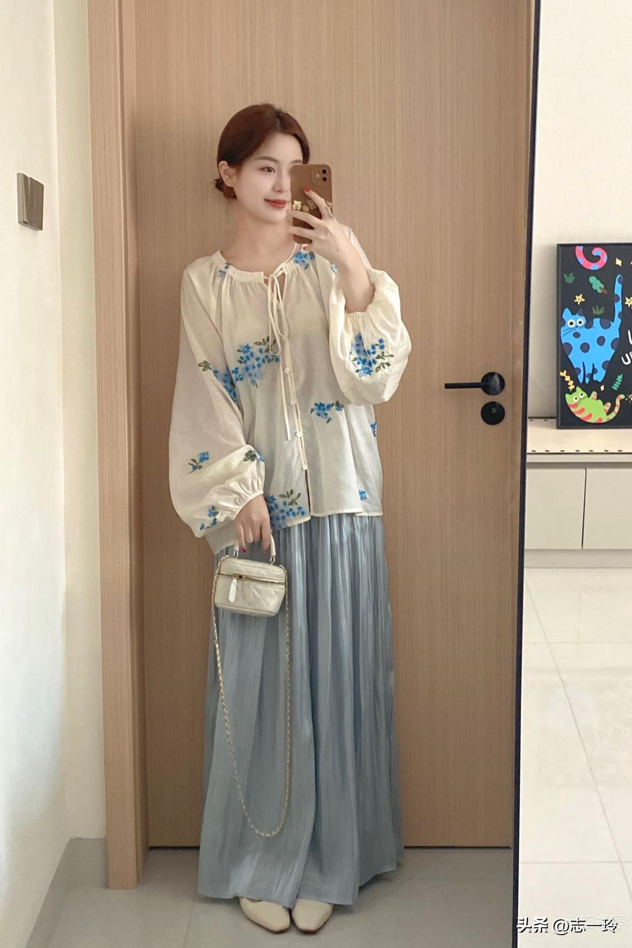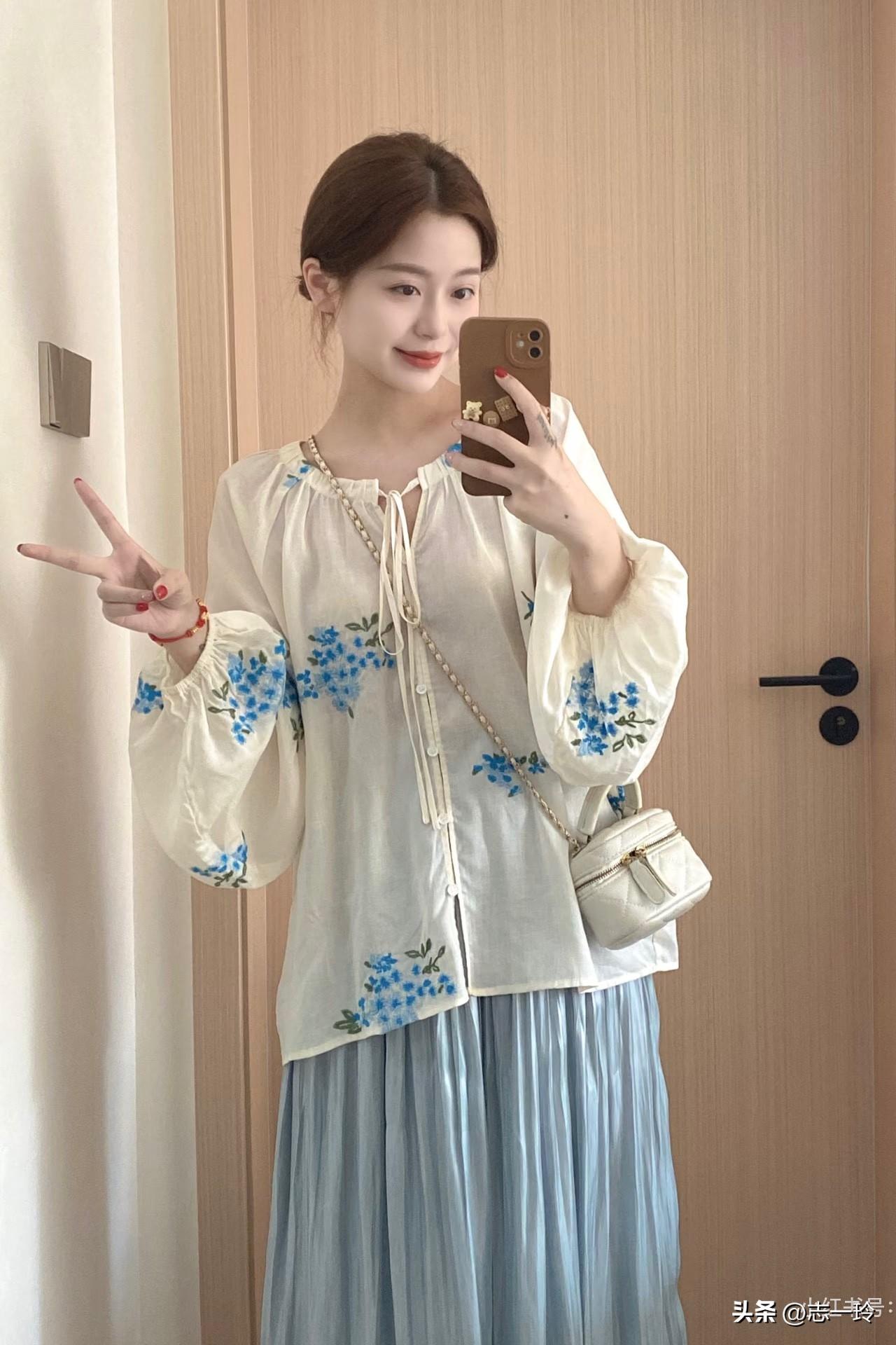 清新穿搭指南:白色绣花上衣+蓝色长裙,轻松自在!