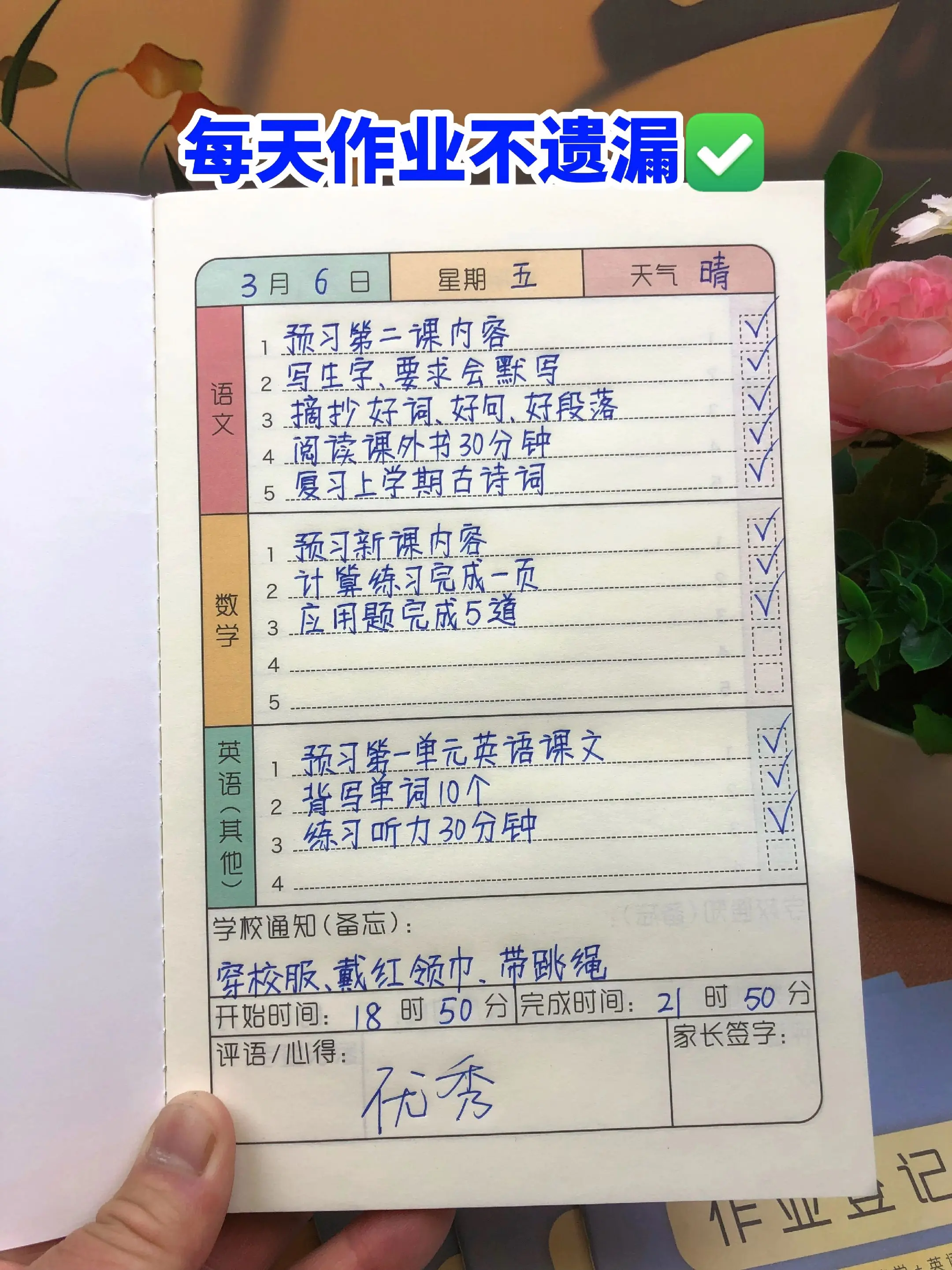 女儿一年级就养成的好习惯,用作业登记本 每天作业从没有遗漏,科目分类清晰明了,始终相信先有好习惯,再有好成绩。