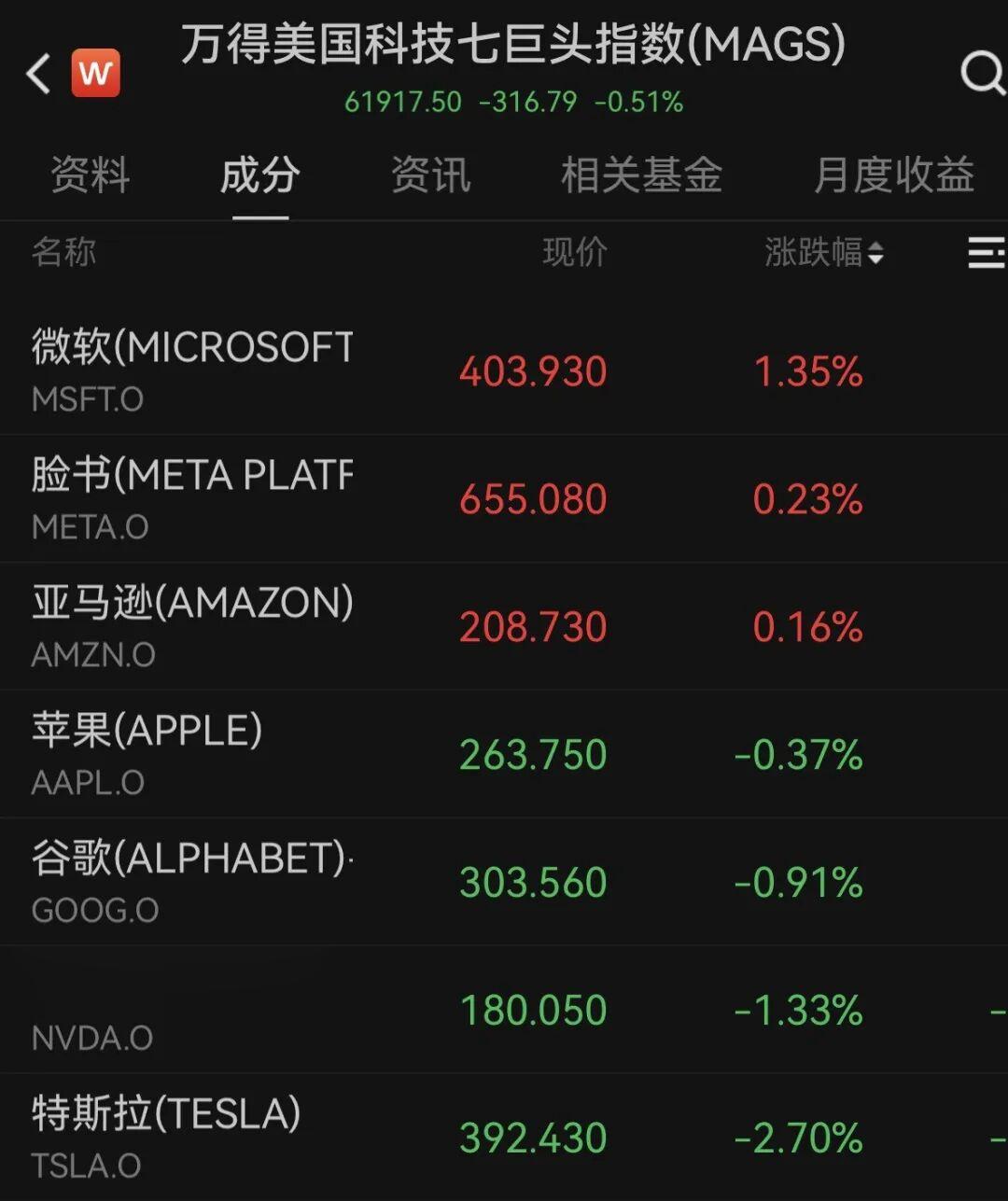 美股大型科技股涨跌互现,万得美国科技七巨头指数下跌0.51%。个股方面,特斯拉跌超2%,英伟达跌超1%,微软涨超1%。