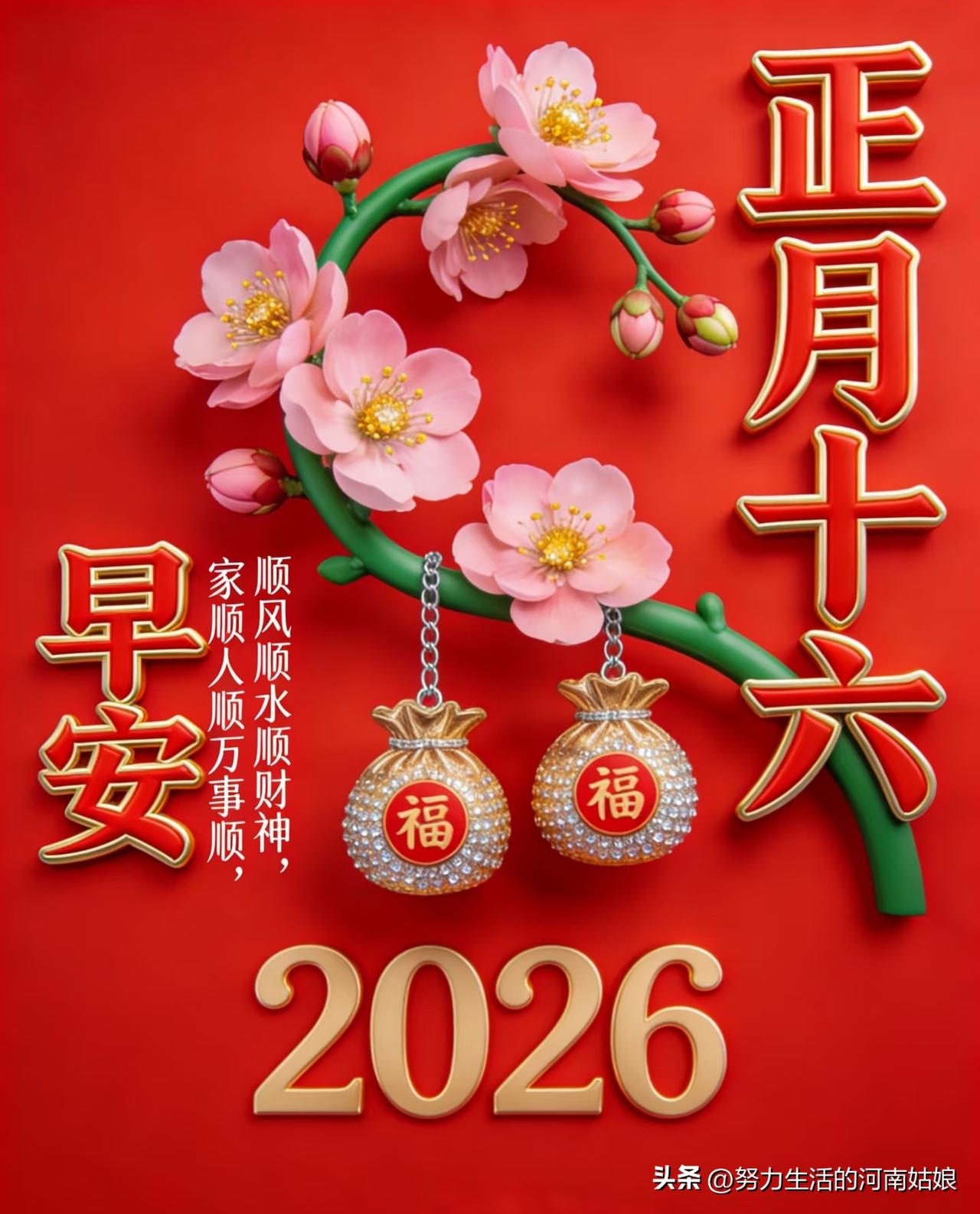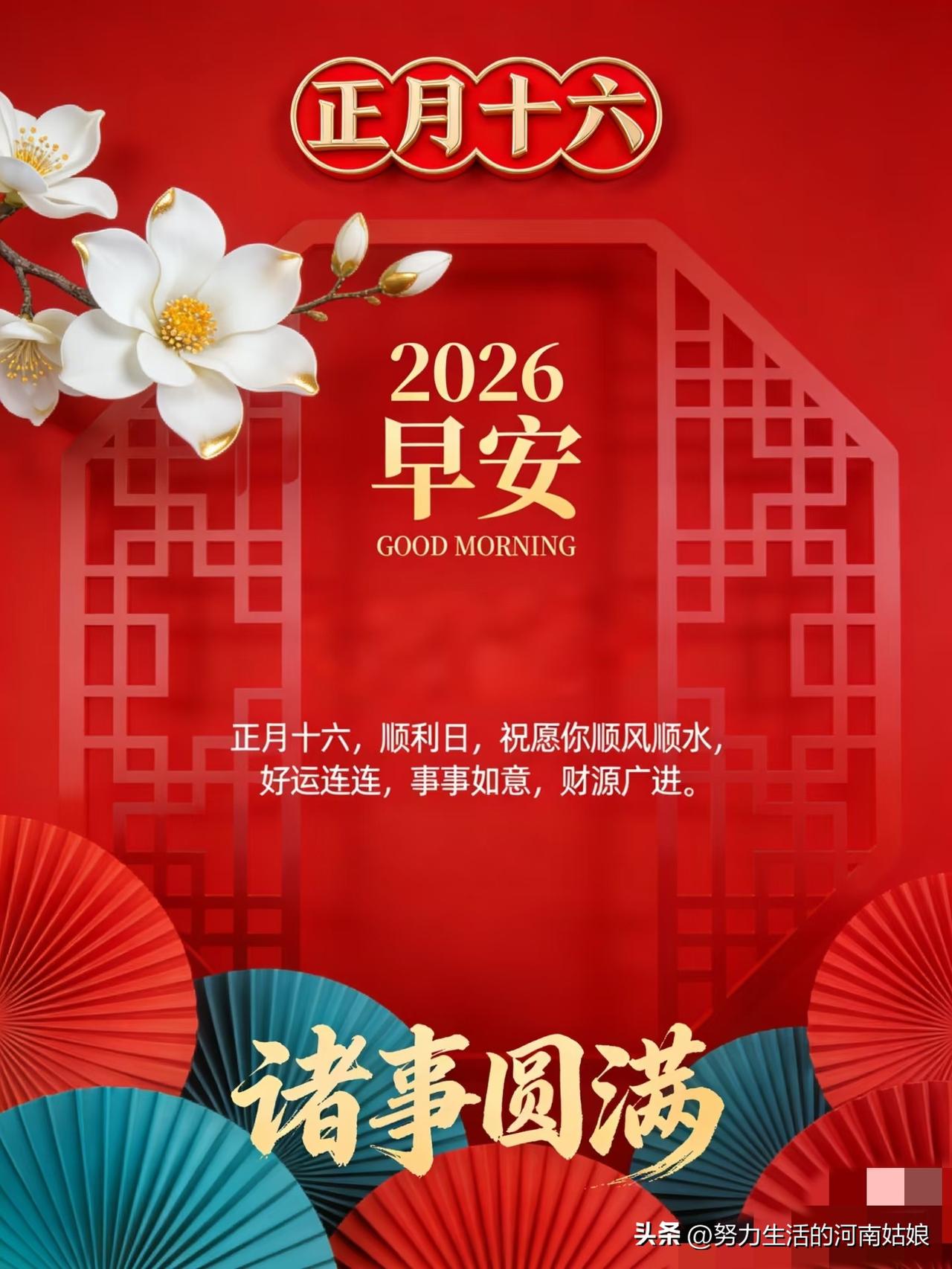 正月十六,周三早安。 年已渐远,心仍温暖, 愿日子清欢不扰,所愿皆所得[玫瑰]  正月十六,早安。 卸下年味,轻装上阵, 新的一周,平安顺遂,万事舒心。[招财进宝] 正月十六,周三安康。 烟火向星辰,所愿皆成真, 愿你眼里有光,心中有爱,一路春暖花开。[比心]  正月十六,早安。 新的开始,新的温柔, 不急不躁,不慌不忙, 生活慢慢,幸福满满。[心] 正月十六,周三早安。 愿岁月温柔,诸事皆顺, 三餐四季,平安喜乐,日日是好日。[福]正月十六 周三