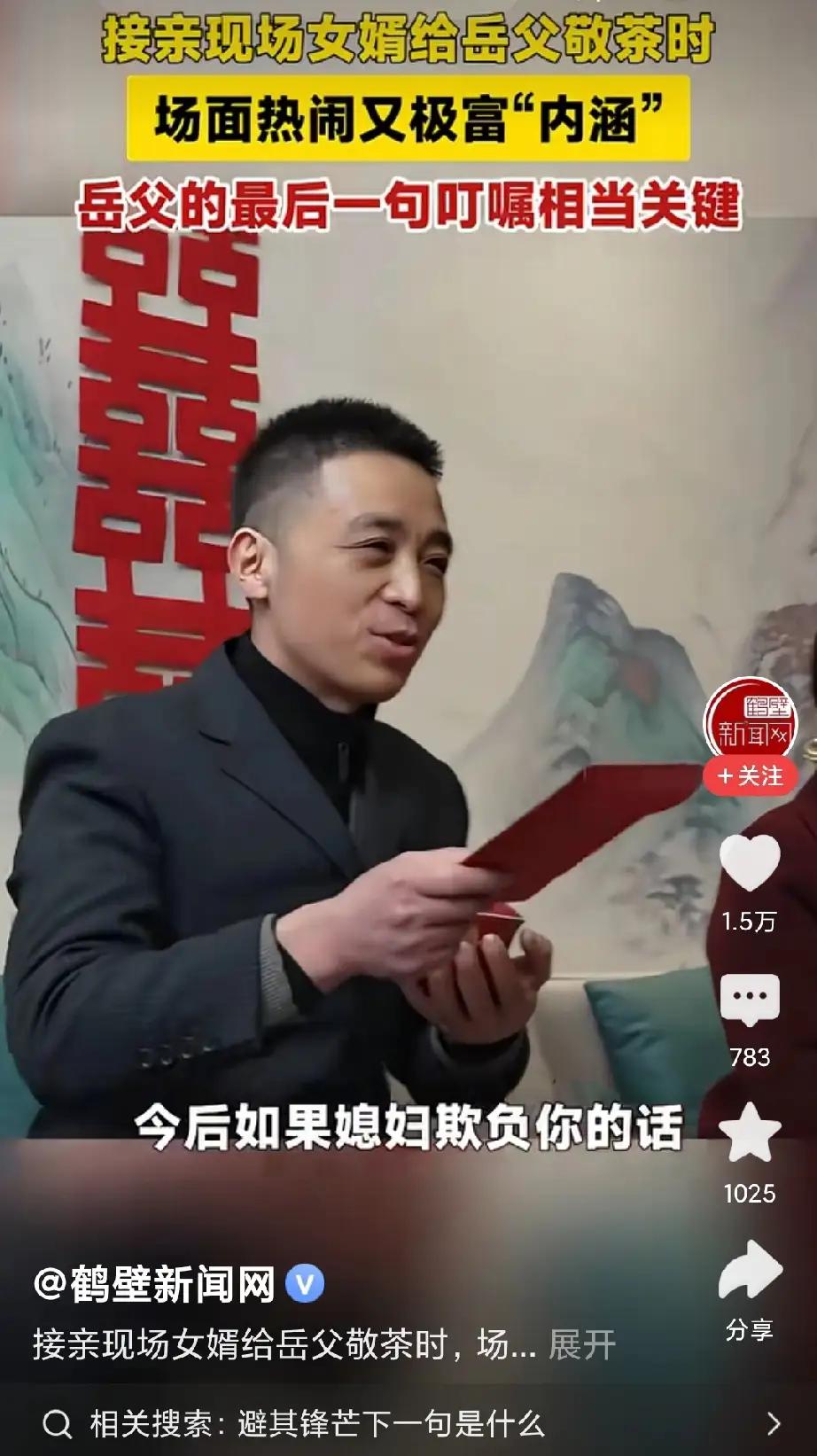 岳父一句“避其锋芒”火遍全网:高情商家庭的顶级智慧,才是婚姻最硬的后台! 近日,一段女婿给岳父敬茶的视频在网络上疯传,瞬间引爆了无数网友的热议。画面中,没有传统婚礼的沉重与泪眼婆娑,取而代之的是一片欢声笑语。这位岳父年轻帅气,看起来竟与女婿如同兄弟般相仿;岳母气质优雅,佩戴着亮闪闪的大耳环,整个人容光焕发。然而,真正让这条视频登上热搜榜首的,并非这一家子令人羡慕的“神仙颜值”,而是老丈人在席间说出的那句充满哲理的叮嘱:“有售后,给你撑腰,但记得要‘避其锋芒’。” 这短短八个字,看似幽默调侃,实则道尽了婚姻经营的最高智慧,也让无数已婚人士直呼“扎心”又“通透”。 视频中的场景温馨而有趣。当女婿恭恭敬敬地端起茶杯改口喊爸时,这位年轻的岳父并没有摆出长辈的架子,反而用一种近乎哥们儿的语气开启了这场“婚前最后一课”。他笑着对女婿说:“我女儿被我养得脾气不好,你以后多担待。家里永远是你的后盾,受了委屈尽管回来,我们给你撑腰。但是——"话锋一转,岳父眼神中闪过一丝狡黠,“切记要‘避其锋芒’。” 这句话一出,现场笑声雷动,而屏幕前的网友们更是炸开了锅。有人感叹:“这老丈人情商太高了!”也有人自嘲:“我家要是也有这种售后就好了。”更有人一针见血地指出:“避其锋芒”这四个字,简直是保命真理,是维持家庭和谐的黄金法则。 为什么这句话能引发如此巨大的共鸣?因为它戳中了无数婚姻中的痛点。在传统的观念里,娘家人往往是女儿受委屈时的“复仇者联盟”,一旦小两口吵架,父母不分青红皂白就要替女儿出头。然而,这位岳父却用一种极高明的方式化解了潜在的矛盾。他首先给了女婿一颗“定心丸”:我们家是有售后的,你不是孤军奋战,如果你真的被欺负了,岳父岳母绝对是你坚强的靠山。这种态度,极大地消除了女婿融入新家庭的陌生感和恐惧感。 紧接着,他又抛出了“避其锋芒”的警告。这既是对女婿的保护,也是对女儿的维护。他深知自己的女儿性格火爆,若是硬碰硬,只会两败俱伤。所谓的“避其锋芒”,不是让女婿无底线地忍气吞声,而是教导他在面对冲突时,要学会以柔克刚,学会在情绪爆发的风口浪尖暂时退让,等冷静下来再沟通。这是一种成熟男人的处世哲学,更是维系长久婚姻的秘诀。 评论区里,无数网友分享了自己的亲身经历,让人啼笑皆非。一位网友写道:“我第一次去丈母娘家,老丈人也跟我说‘我女儿脾气不好,你多担待’。我当时以为只是客套话,觉得老婆挺温柔的。婚后才知道,老丈人真的一点都没客气,那是真实的‘产品说明书’啊!”另一位网友则吐槽自家截然不同的待遇:“我跟我老公一吵架,我爸妈全说是我的错,生怕女婿跑了;可我婆婆却总觉得她儿子是对的。要是我也能有这样一位明事理、懂幽默的岳父,做梦都能笑醒。” 更有意思的是,许多网友从这位岳父身上看到了"80 后”父母的缩影。视频中岳父岳母看起来不过四十出头,时尚洋气,完全没有传统长辈的暮气沉沉。正如网友所言:"80 后最大的也才 46 岁,正是上有老下有小的年纪,但这心态简直太年轻了。”他们不再把嫁女儿看作是“泼出去的水”,也不再沉浸在离别的悲伤中,而是用一种开放、幽默甚至略带戏谑的态度,祝福孩子们开启新生活。这种轻松的家庭氛围,恰恰是当代年轻人最向往的亲子关系。 其实,“避其锋芒”不仅仅适用于女婿对妻子,它同样适用于所有的亲密关系。婚姻从来不是讲理的地方,而是讲爱的地方。当争吵发生时,争个输赢往往赢了道理输了感情。这位岳父用一句玩笑话,传递了一个深刻的道理:在家里,示弱不是软弱,而是一种包容的智慧;退一步不是认输,而是为了走更远的路。 看着视频中那对年轻活力的父母,听着那句充满温情的叮嘱,我们不禁感慨:最好的家庭教育,不是灌输多少大道理,而是父母以身作则,展现出乐观、豁达的生活态度。这样的家庭走出来的孩子,大概率也是开朗自信、通情达理的。难怪网友们纷纷留言:“这样的岳父哪里领?”“我也想找个这样的亲家!” 婚姻是一场漫长的修行,而原生家庭的态度往往是这场修行的第一块基石。这位岳父用他的幽默与智慧,为女儿的新婚生活铺就了一条温暖而宽广的道路。他告诉所有人:爱,是给你兜底的勇气,也是教你相处的艺术。愿每一对新人都能遇到这样通情达理的家人,愿每一个家庭都能在“避其锋芒”的智慧中,收获属于自己的幸福与安宁。毕竟,家和万事兴,这才是人间最顶级的风水。岳父对女婿 宴请丈母娘 高情商丈母娘