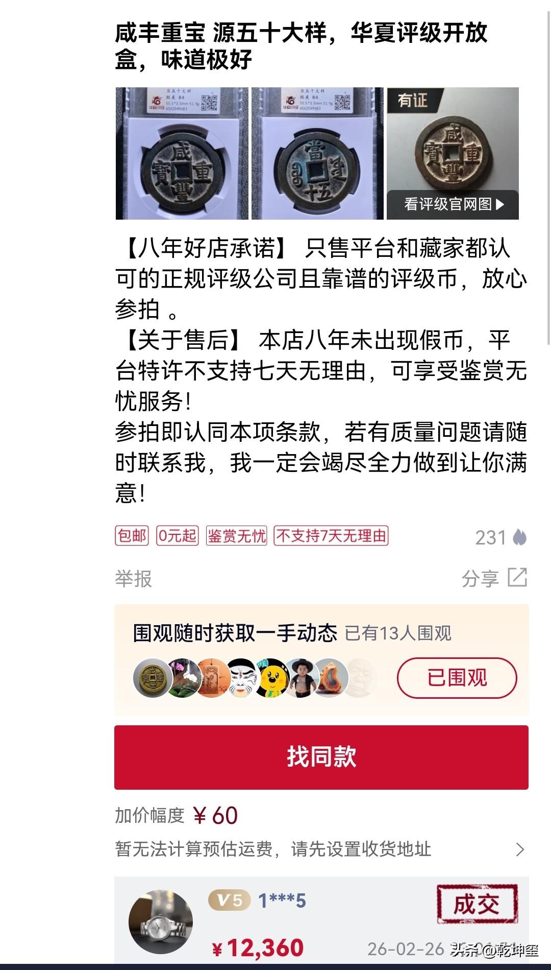 咸丰宝源局当五十大样能值多少钱? 2月26日在某拍堂成交了一枚咸丰大钱,宝源局当五十大样钱,直径55+毫米,克重51克,经过多次竞拍,以12360元的价格落锤。 这枚钱币,整体来说属于上品,华夏给出的84分评级,按此价格,已经和最高峰时的价格接近了,也就是说,古钱币行业触底反弹了?大家认为呢?咸丰大铜钱 咸丰重宝铜钱 咸丰当五百样钱