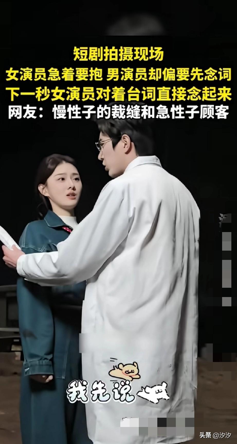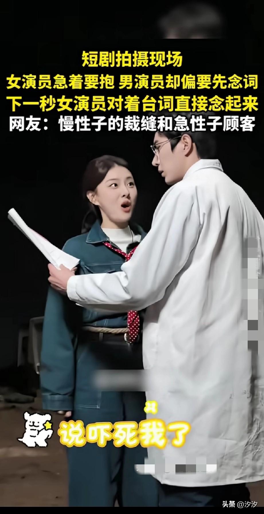 没想到短剧拍摄现场也这么搞笑, 短剧拍摄的时候男女演员对戏, 女演员非要求着抱, 男演员却坚持先说词再报, 结果女演员着急了, 看了台词之后告诉他, 先把我拉入怀中, 然后把我的头埋进你的怀里, 然后说吓死我了, 男演员的理解能力真的很差, 一看上学的时候就是学渣, 连这么简单的台词都理解不了, 这让急性子的女演员真受不了, 怪不得网友说这是慢性子的裁缝和急性子的顾客! 把旁边的导演都整笑了, 短剧拍摄现场欢乐多, 怪不得现在的人都喜欢看短剧, 又疯又癫,又不需要智商! 主打一个开心快乐! 为什么短剧会成为流行趋势 短剧拍摄乱象 演戏的尴尬瞬间 爱情剧拍摄花絮 影视剧短剧拍摄
