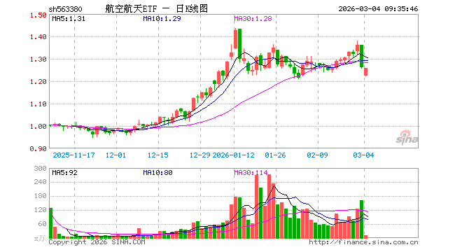 3月4日,航空航天ETF(563380)开盘跌3.01%,报1.223元。航空航天ETF(563380)重仓股方面,航天电子开盘跌3.11%,中国卫星跌4.38%,航发动力跌1.44%,中航沈飞跌1.17%,中航光电跌1.06%,中航西飞跌1.60%,中航机载跌1.35%,中航成飞跌1.74%,中航重机跌1.63%。