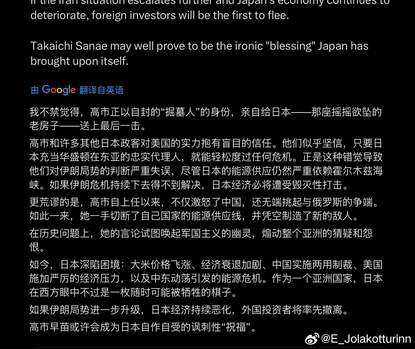 3. 高市早苗和一众日本政客迷信美国的力量,总以为可以狐假虎威,在东亚充当美西方的马前卒。正是这种迷信,让日本误判了伊朗局势。