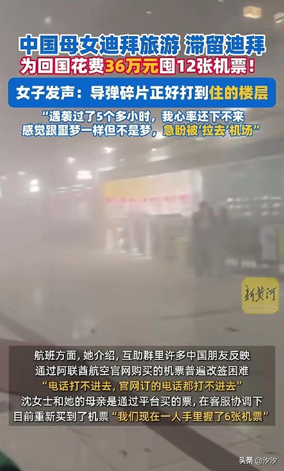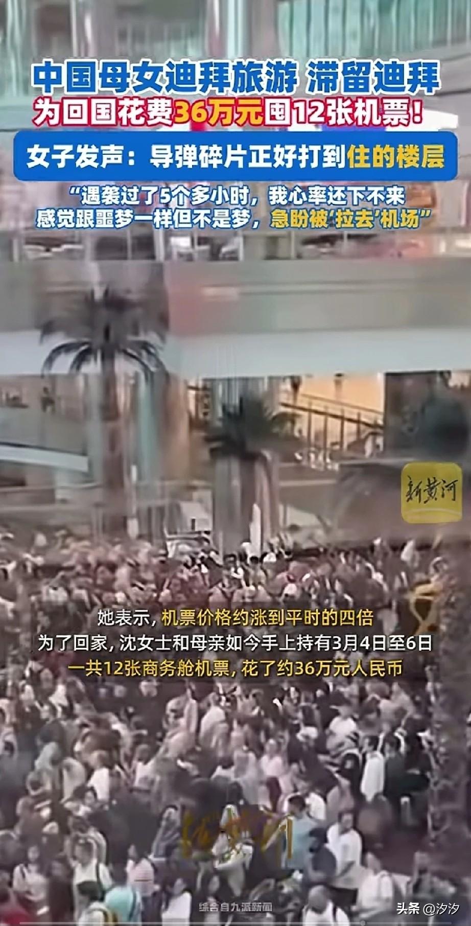 还是有钱人会玩, 中国沈女士和母亲2月27号来迪拜游玩,本来打算3月7号回去, 还入住了迪拜的最高建筑帆船酒店, 这可是全球唯一的七星级酒店, 当大多数牛马都在返岗上班, 人家却开启了迪拜豪华游, 结果却遇到了中东战乱, 而且导弹正好击中了她们入住的那一层,让她们火遍网络的是, 为了回去居然花36万囤了12张商务舱, 虽然价格比平时贵了四倍, 保命的心思让她们顾不得价格上涨, 只是一门心思的想回国, 沈女士还表示, 在遇袭5小时内自己的心率一直下不去, 感觉像是在做噩梦,但又不是梦, 急切盼望自己被拉到机场, 在战争面前个人真的很渺小, 果然有钱人玩的就是刺激, 不经意间还见证了历史, 大家觉得他们的经历是不是很刺激? 迪拜旅行见闻 迪拜五星酒店 迪拜旅游路线 迪拜旅游业 迪拜旅游记 迪拜土豪游