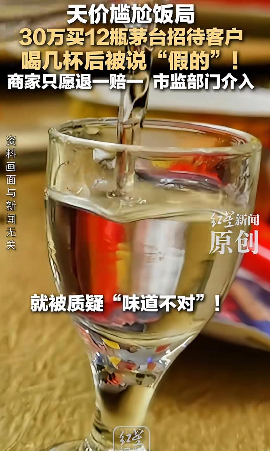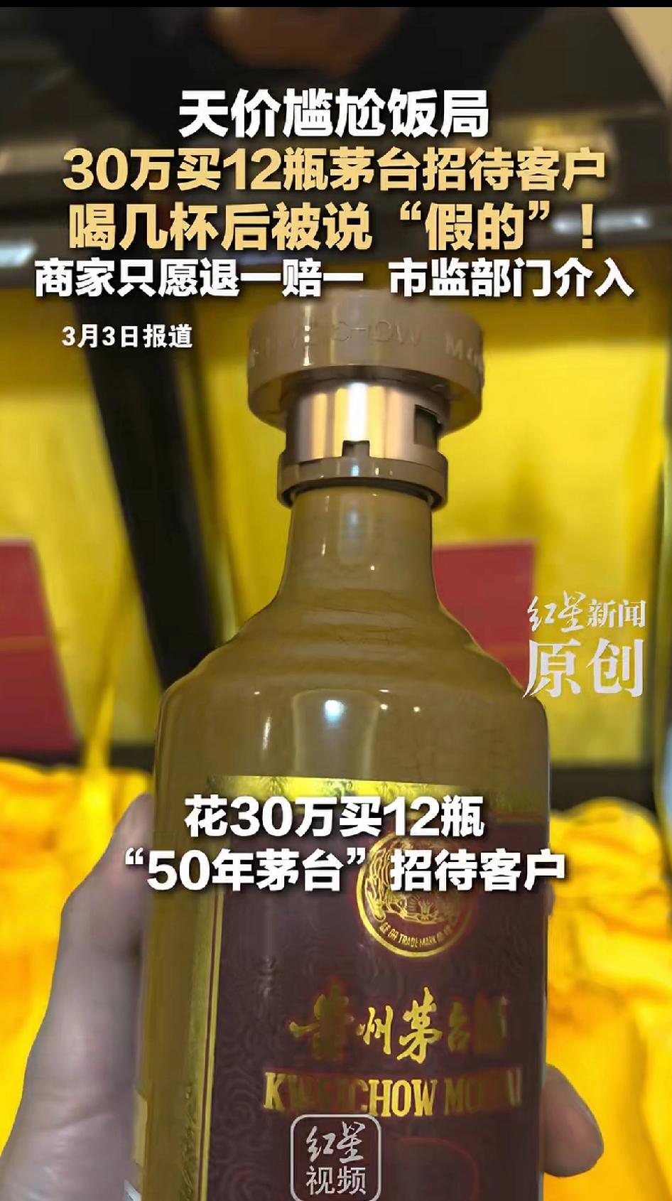 天价尴尬饭局,30万买12瓶茅台招待客户,喝几杯后被说是“假的”!商家自愿退一赔一,市场监管部门介入。 四川德阳的魏先生,因公司接待需求,他长期与广盛昌经营部合作,对其颇为信任。2025年10月1号,他花30万8千块在广盛昌买了12瓶“50年茅台酒”,店家还承诺“假一赔十”。 魏先生送人几瓶,剩下几瓶招待客人,结果饭局上客人一喝就觉得不对味,场面一度十分尴尬。 魏先生:原本打算用茅台招待客人,结果喝出来是假酒,严重影响我的信誉。”魏先生说,情急之下,他当场拨通了酒水提供商广盛昌经营部的电话,并开启免提,试图求证。 电话中,魏先生对酒水质量提出质疑,并要求退货退款,但对方态度坚决,一口咬定“酒没问题,假一赔十”,当场拒绝了魏先生的退货要求。 商家此刻拒不承认自己售卖的是假酒,后来魏先生将1瓶送检被第三方鉴定机构鉴定为“不符合标准要求”,5瓶被贵州茅台酒股份有限公司鉴定为“与公司产品特征不相符”。 魏先生较真送检,先是一家鉴定机构说不符合标准,商家不认。后来茅台官方鉴定,送检的5瓶全是假的。可商家却甩锅,说自己是中间商不知情,酒是从收老酒的店里东拼西凑来的。 魏先生购买酒时,商家当初还书面承诺“假一赔十”,但魏先生的维权过程并不顺利,“我都已经退了一步,考虑到实际情况,我也不说要他假一赔十,只要求他们把这送检的6瓶酒退一赔三。 ”魏先生指着出库单上的“假一赔十”承诺告诉记者,“但现在他们只愿意退一赔一,或者拿点老酒来给我抵。万一拿来的又是假的,又会惹麻烦。 商家拿老酒赔偿魏先生,魏先生考虑到如果还是假酒该怎么办?到时候又要扯皮。现在监管部门介入,希望假酒事件商家能给魏先生一个交代。 这商家为了钱毫无底线,显然魏先生是商家的老顾客了,明明卖的假酒还敢出书面证明,并保证假一赔十,结果两家都鉴定出来是假酒,商家对原先的假一赔十保证,做出回应。 魏先生提出的退一赔三商家也不愿意执行。最后只能看市场监管部门给出合理方式。