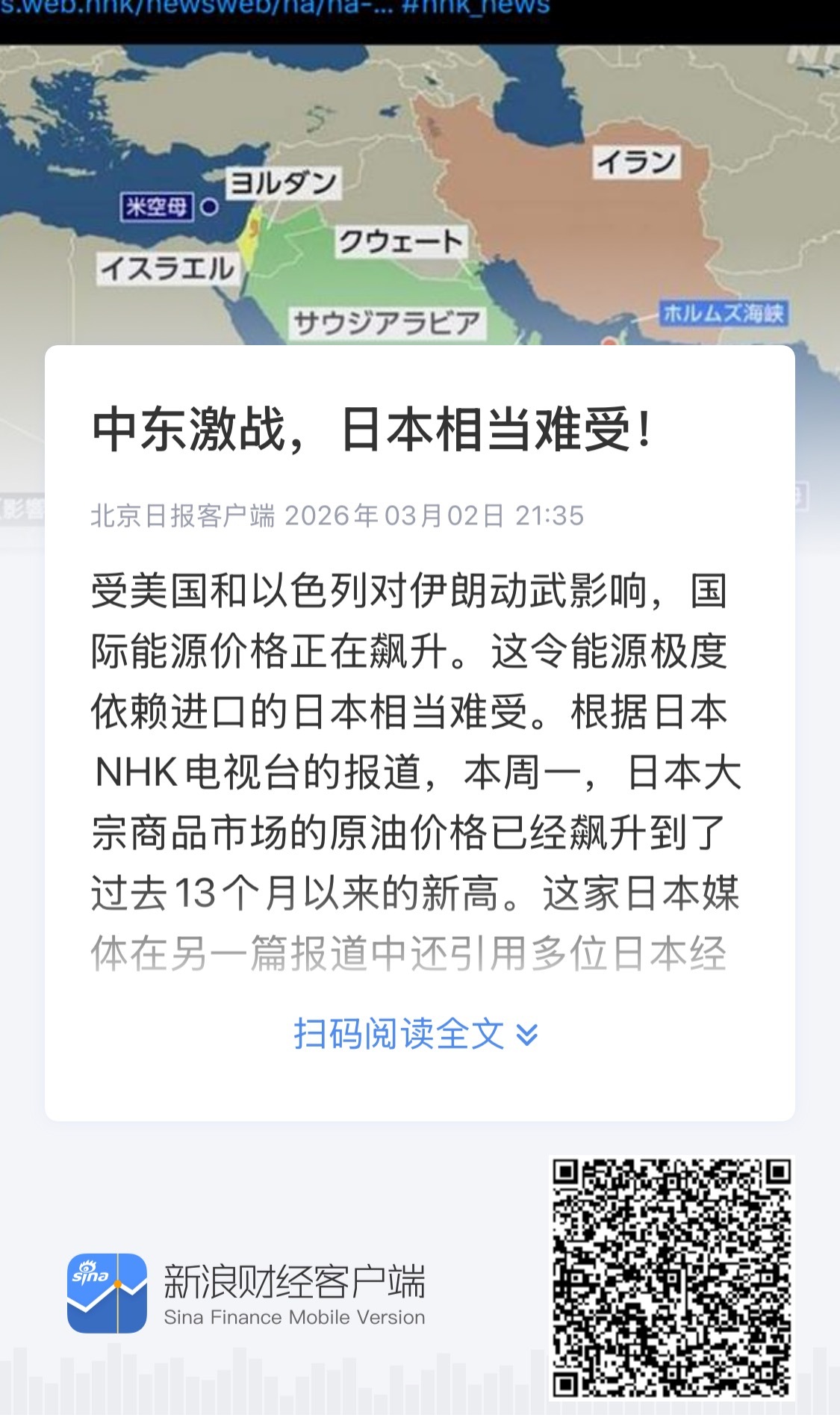 这家日本媒体在另一篇报道中还引用多位日本经济专家的分析称,如果这场战争发展成持久战,令霍尔木兹海峡长期无法通航,还将给日本许多行业的生产和运输——包括农业和渔业——都造成冲击,因为电费燃气费等一系列成本都会大幅增加。日本的GDP甚至可能因此被拉低三个百分点,演变成对日本“生死攸关的问题”。