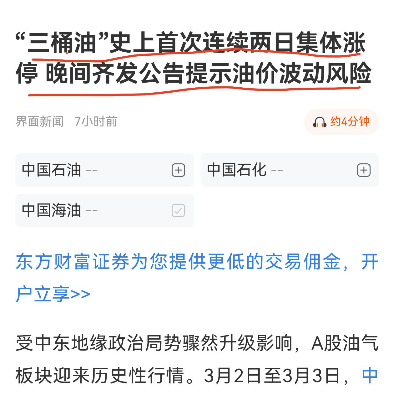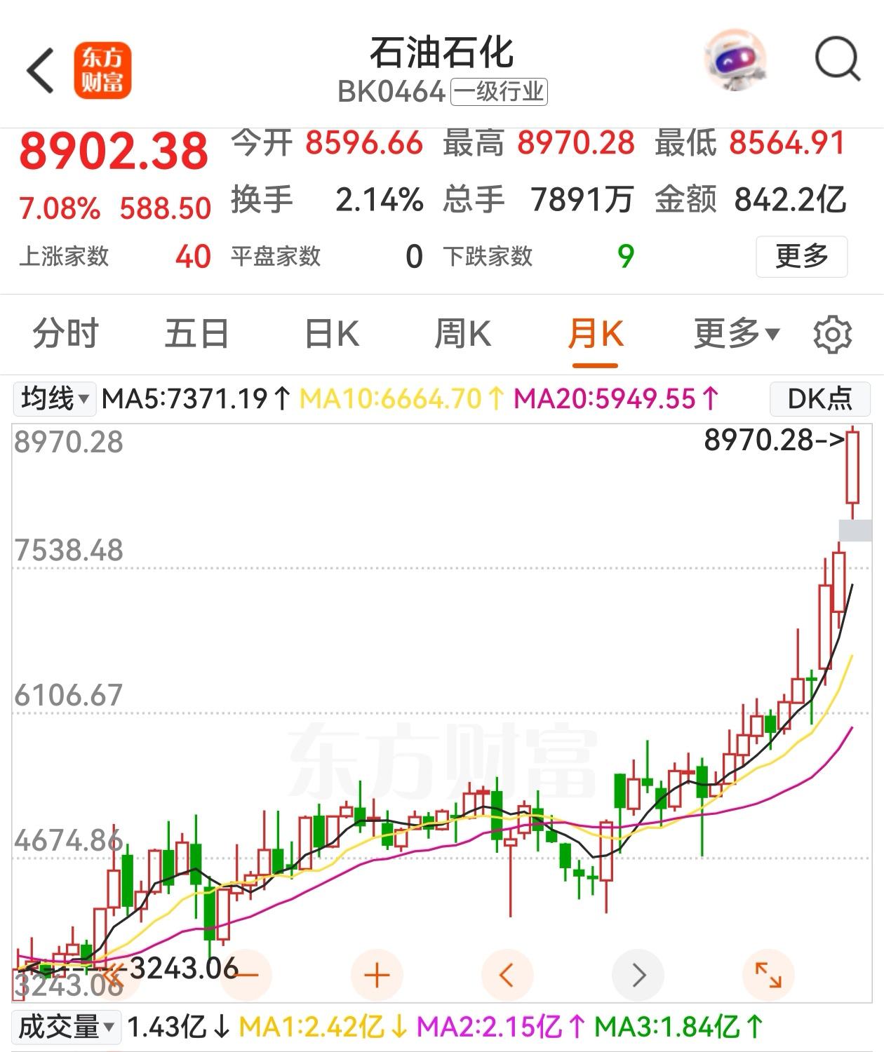中东战火点燃石油燃气行情,对比一下2022年4月俄乌冲突爆发时的走势,可以读懂一些问题。 俄乌冲突爆发时: 纽约原油期货:87美元涨到130美元,最大涨幅49.4%; A股石化板块指数:4449点涨到5097点,最大涨幅14.9%; 中石油股价:3.54元涨到4.43元,最大涨幅25%。 这次中东战火爆发: 纽约原油期货:64.8美元涨到77.98元,最大涨幅20%;(冲突烈度攀升,价格还可能上涨) A股石化板块指数:7579点涨到8970点,涨幅18%; 中石油股价:10.8元涨到13.15元,涨幅30%。 第一:突发地缘冲突引起的原油价格波动不会持久,原油整体供大于求不变,不久后原油价格会回归; 第二,中东战火后至今,原油期货涨幅远小于俄乌冲突时的涨幅; 第三,中东战火后至今,A股石油板块,中石油的涨幅超过俄乌冲突时的涨幅。 第四,2022年以来,A股原油板块处于上升通道,主要是国内经济和资本市场改革的结果; 第五,突发事件只会暂时影响股价波动,不会改变长期趋势。近几天油气板块的暴涨可能引起回调; 第六,国际能源署已准备好动用原油储备,以应对市场动荡;油气板块公司已发布分险提示公告。情绪性炒作的时候保持一分冷静,有利于保住盈利果实,控制回调的风险。