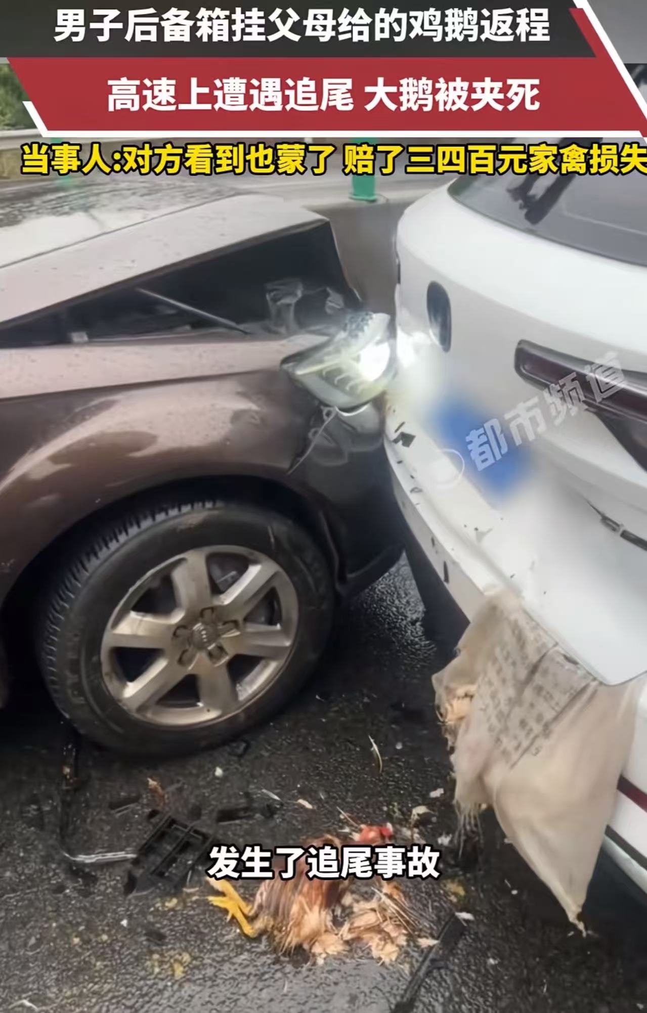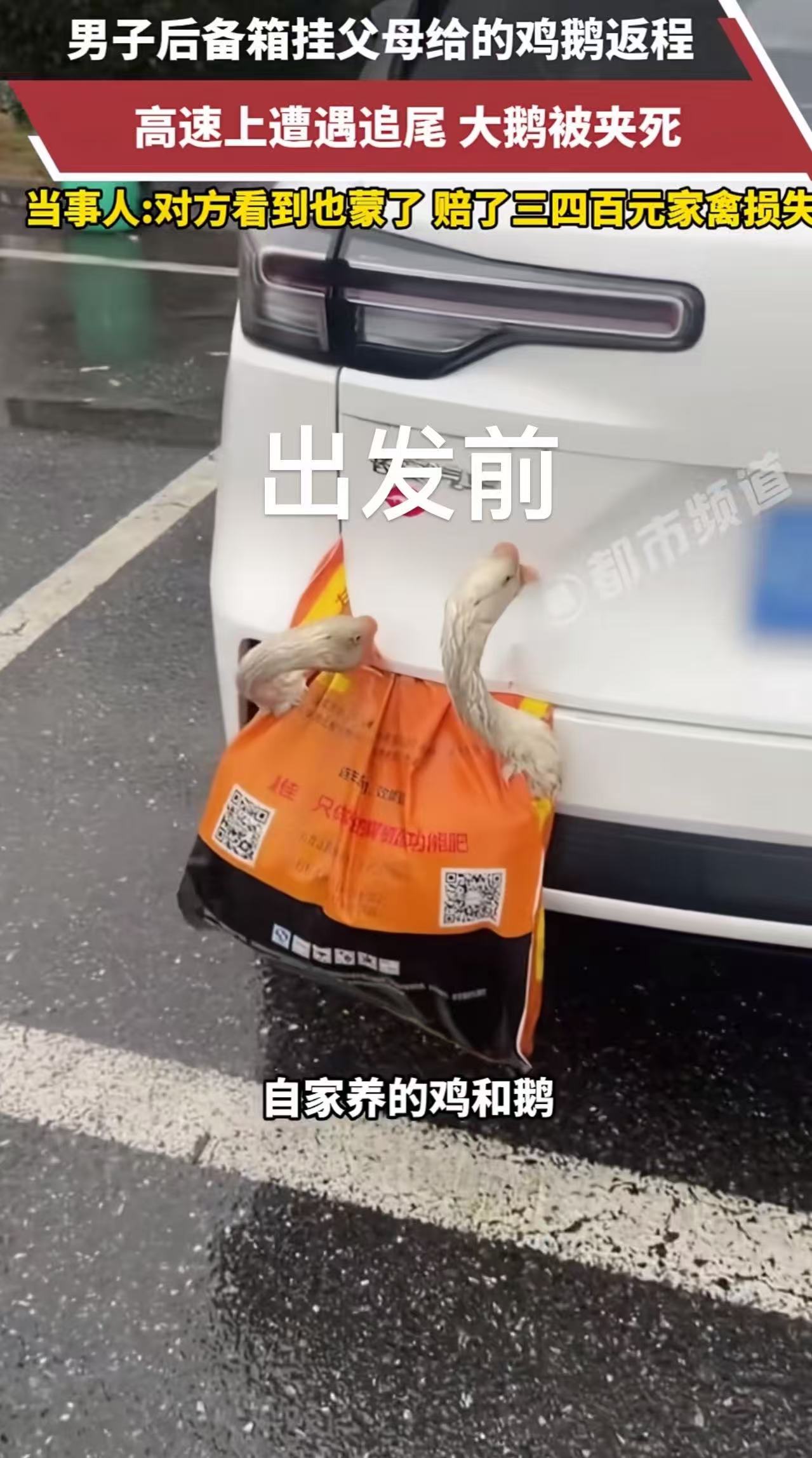 “本以为两死一伤,结果是‘俩菜一汤’!”湖北,男子后备箱挂父母给的鸡、鹅返程,高速遭追尾,鹅被活活夹死!鸡也嘎了!对方赔了三四百元家禽损失,那么问题来了:“钱赔了,鸡和鹅应该给谁!”