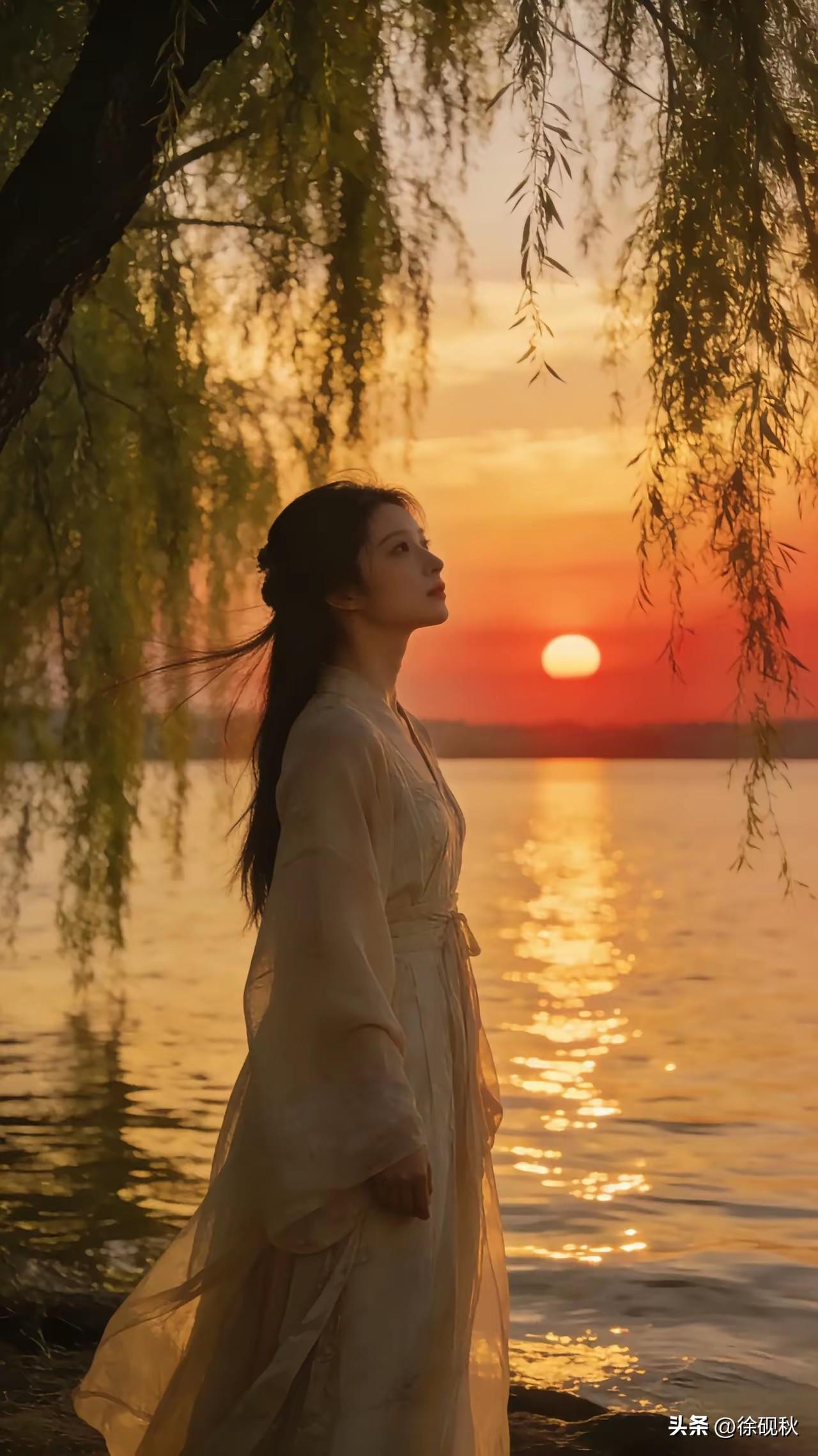 落日斜晖醉客魂, 晚风轻起念伊人。 堤旁细柳含情立, 相思入骨意更深。