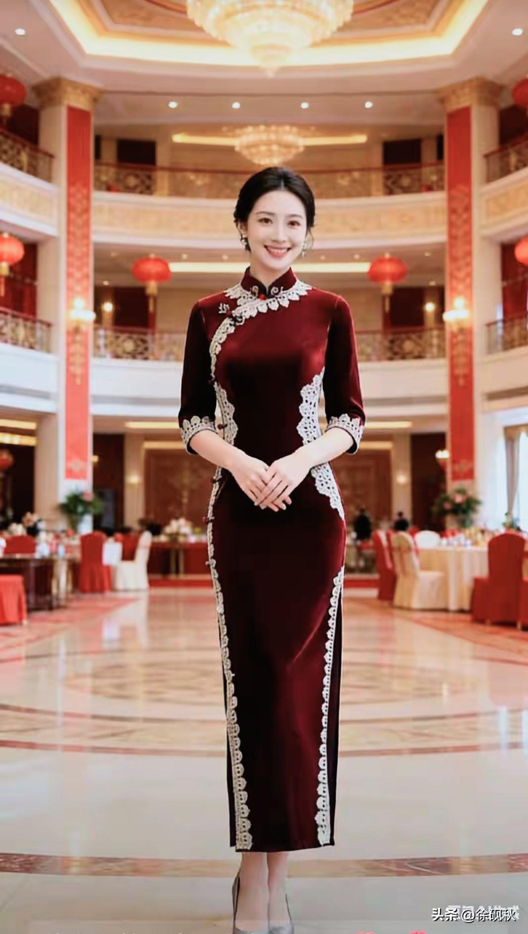 国风古韵,文化传承。 酒红旗袍,东方绝色。 雍容华贵,仪态万方。 贴身裁剪,凸显性感。 千种妩媚,万般风情。