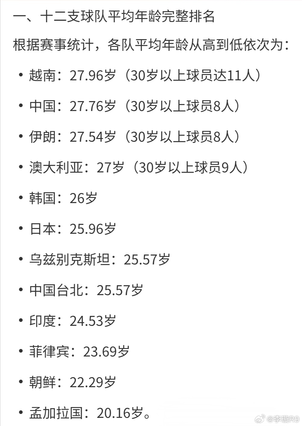 …………………………………………………………本届亚洲杯,中国女足的平均年龄是27.76岁,位居所有参赛球队的第二,而孟加拉国队是最年轻的,平均年龄是20.16岁。就这场比赛的首发来看,中国女足首发平均年龄29岁,孟加拉国女足平均年龄20.8岁。这种情况下,我们的球员居然“略显紧张”,有点儿让人不好理解。尤其是孟加拉球员平均身高只有1.49m,就不说比赛经验,从身体条件来说,中国女足也有绝对优势,可从比赛表现来说,真的没有优势和绝对统治力,米立西奇可不能用“略显紧张”蒙混过关。