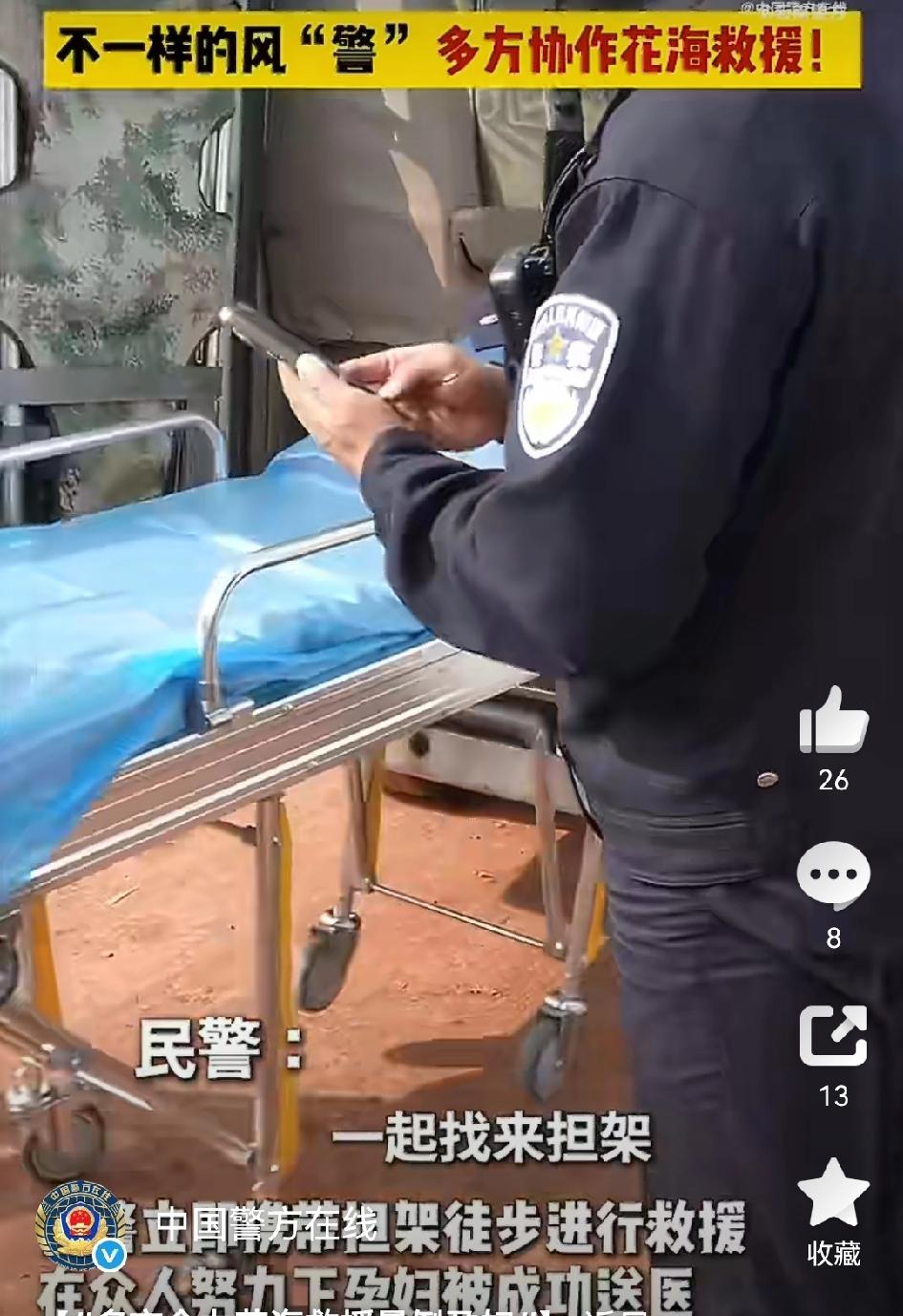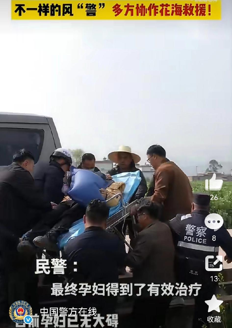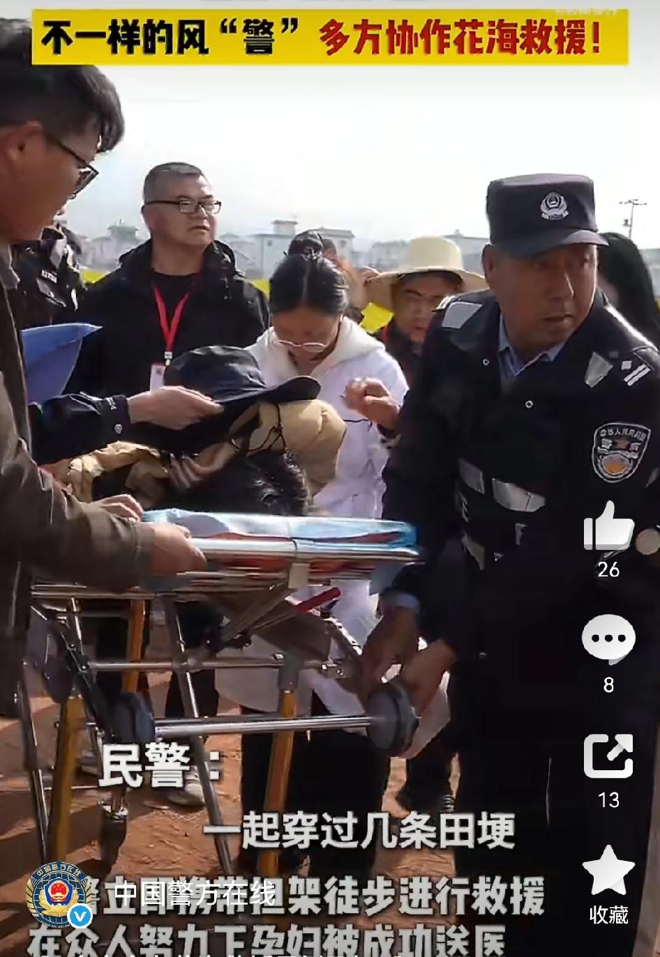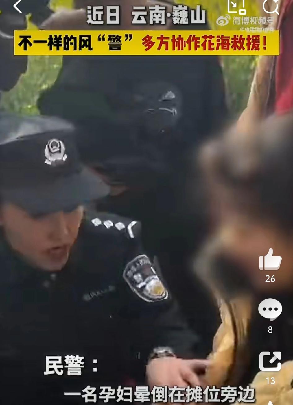 【多方合力花海救援晕倒孕妇】 最近云南大理巍山,一名孕妇游玩时晕倒,大理公安接求助后迅速赶到。事发地拥堵,救护车进不来,民警徒步带担架救援,众人合力把孕妇送医,现在孕妇已无大碍。 [心][心][心]其实类似的暖心救援不少。 6月24日安徽宁国,孕妇突发昏厥,交警和热心群众一起帮忙,递糖果、当“人肉靠背”,等120来了又合力送医。还有南京大报恩寺景区,工作人员高强发现晕倒孕妇后,指挥救援、联系120,最终孕妇得到及时救治。在危急时刻,警民携手、多方合力,总能为生命保驾护航,这份温暖太让人感动!